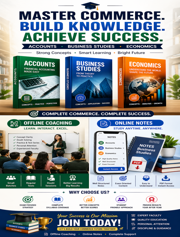 We provide complete and structured coaching for Accounts, Business Studies, and Economics for Class 11 and 12, ensuring strong conceptual understanding and excellent board preparation.