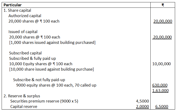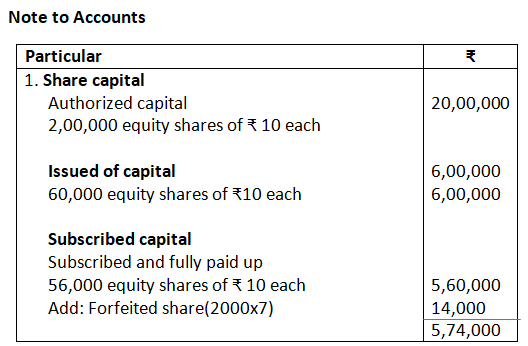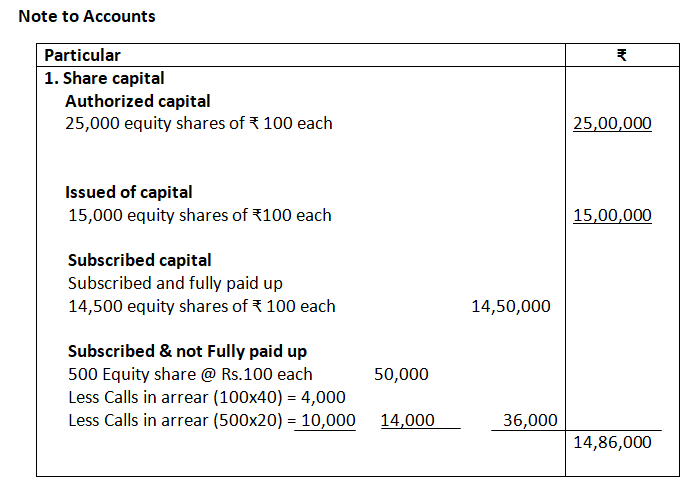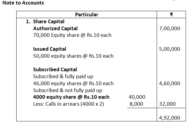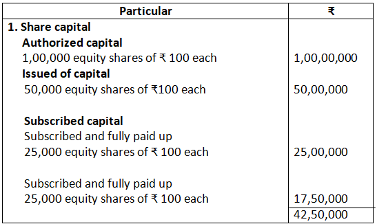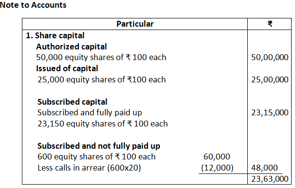 4. Star Ltd. Is registered with capital of ₹ 50,00,000 divided to 50,000 equity shares of ₹ 100 each. The company issued 25,000 equity shares for subscription. Subscription was received for 23,750 shares and all the due amount was duly received, except the first and final call of ₹ 20 per share on 600 shares. Show the ‘share capital’ in the Balance Sheet of the company.