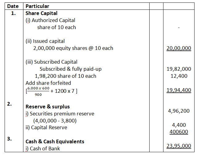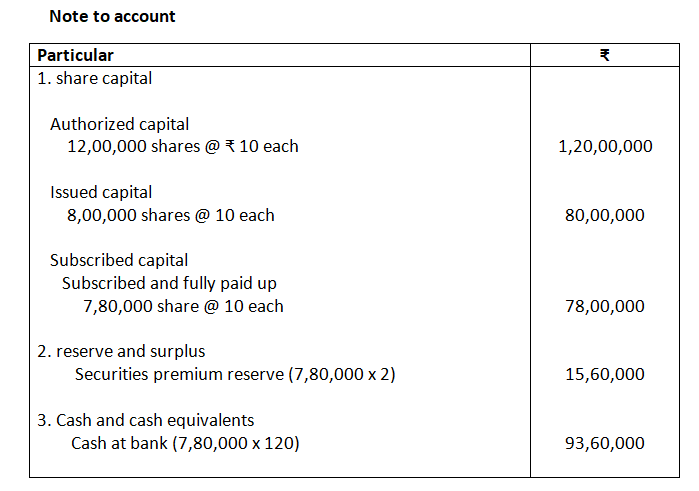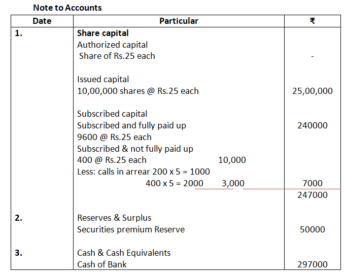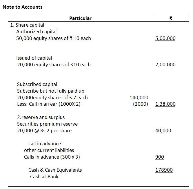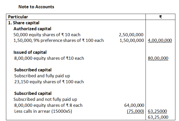 6. Altaur Ltd. Was registered with an authorized capital of 4,00,00,000 divided in 25,00,000 equity shares of ₹ 10 each and 1,50,000, 9% preference shares of ₹100 each. The company issued 8,00,000 equity shares for public subscription at 20% premium, payable ₹ 3 on application; ₹ 7 on allotment [including premium] and balance on call. Public had applied for 10,00,000 shares. Excess application were sent letters of regret. All the dues on allotment were received except on 15,000 shares held by Sanju. Another shareholders Rocky paid his call dues along with allotment on his holding of 25,000 shares. You are required to prepare the Balance Sheet of the company as per Schedule lll of companies Act, 2013, showing share capital balance and also prepare Notes to Accounts.