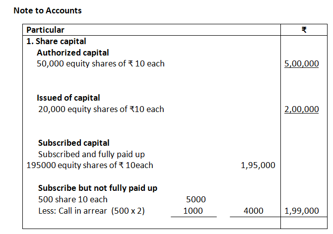 Discloser of share capital in the balance sheet with call in arrears and call in advance
