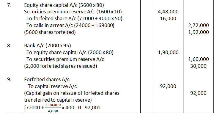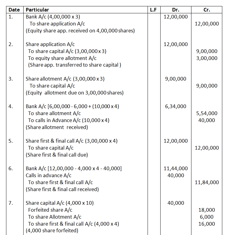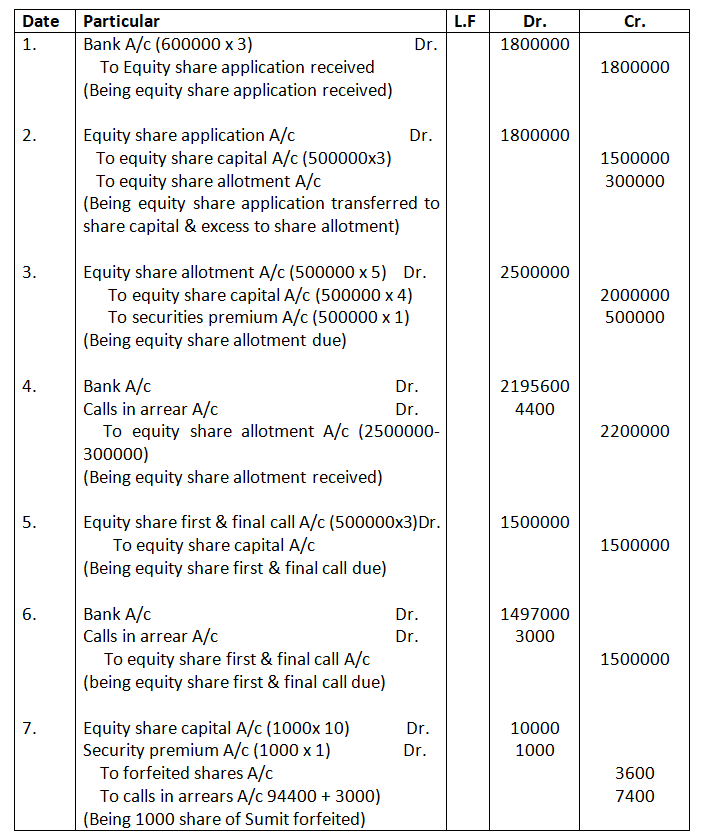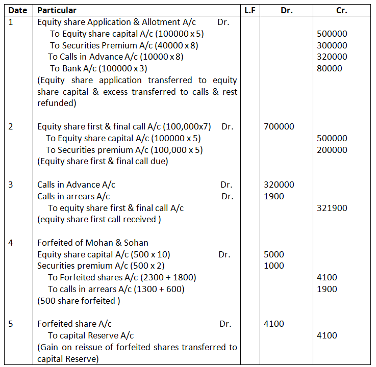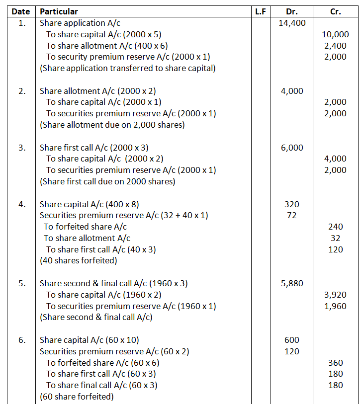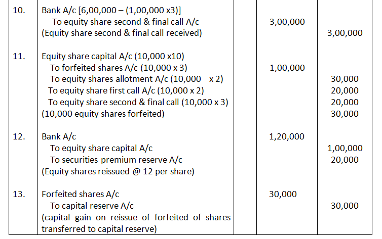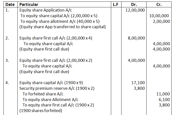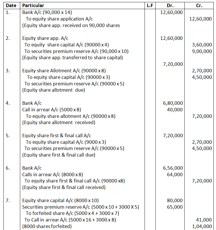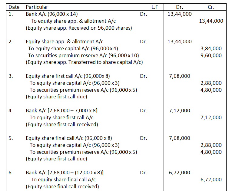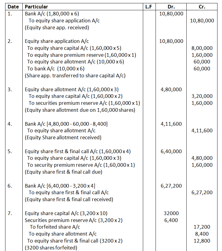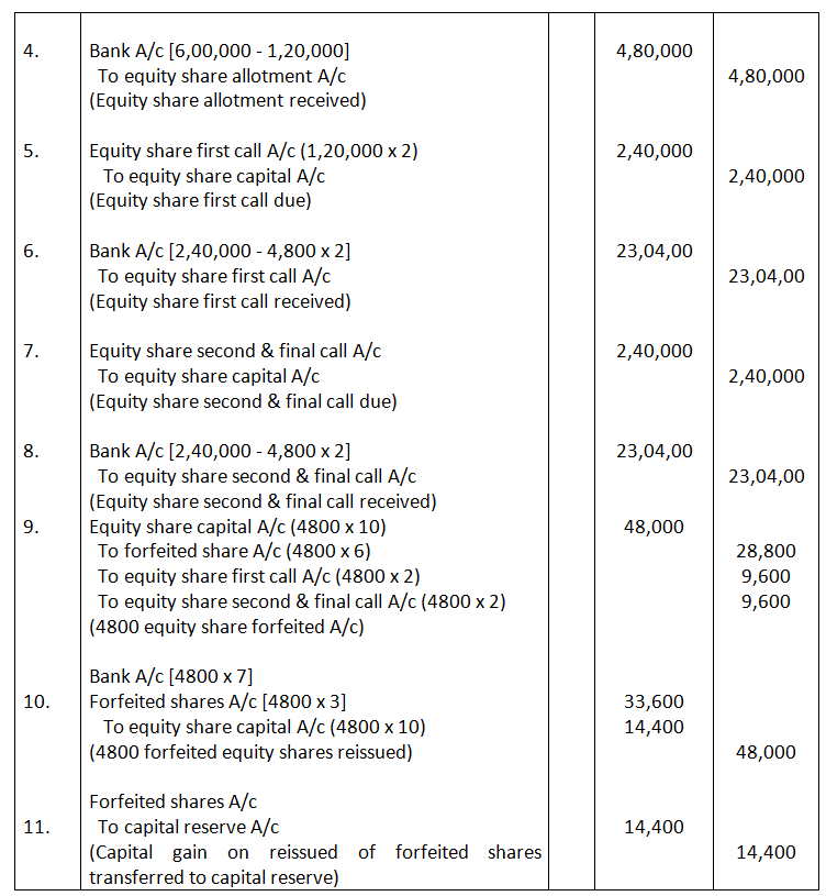 1. 2. 3. 4. 5. 6. 7. 8. 9. | Bank A/c (1,80,000 x 6) To equity share application A/c (Equity share app. received) Equity share application A/c To equity share capital A/c (1,60,000 x 5) To equity share premium reserve (1,60,000 x 1) To equity share allotment A/c (10,000 x 6) To bank A/c (10,000 x 6) (Share app. transferred to share capital A/c) Equity share allotment A/c (1,60,000 x 3) To equity share capital A/c (1,60,000 x 2) To securities premium reserve A/c (1,60,000 x 1) (Equity share allotment due on 1,60,000 shares) Bank A/c [4,80,000 – 60,000 – 8,400] To equity share allotment A/c (Equity Share allotment received) Equity share first & final call A/c (1,60,000 x 4) To equity share capital A/c (1,60,000 x 3) To security premium reserve A/c (1,60,000 x 1) (Equity share first & final call due) Bank A/c [6,40,000 – 3,200 x 4] To equity share first & final call A/c (Equity share first & final call received) Equity share capital A/c (3,200 x 10) Securities premium reserve A/c (3,200 x 2) To forfeited share A/c To equity share allotment A/c To equity share first & final call (3200 x 2) (3200 shares forfeited) Bank A/c To equity share capital A/c (1600 x 10) To securities premium reserve A/c (1,600 forfeited shares reissued) Forfeited shares A/c To capital reserve A/c (Capital gain on reissue of forfeited shares transferred to capital reserve) [ | 10,80,000 10,80,000 4,80,000 4,11,600 6,40,000 6,27,200 32000 6,400 43,000 8,600 | 10,80,000 8,00,000 1,60,000 60,000 60,000 3,20,000 1,60,000 4,11,600 4,80,000 1,60,000 6,27,200 17,200 8,400 12,800 16,000 27,000 8,600 |