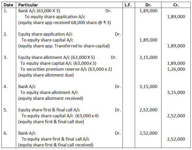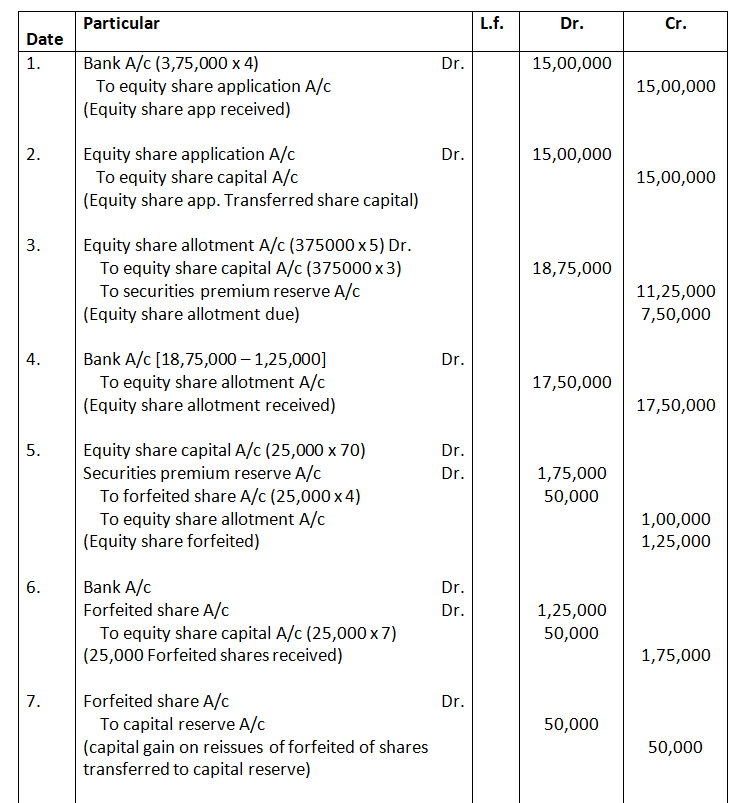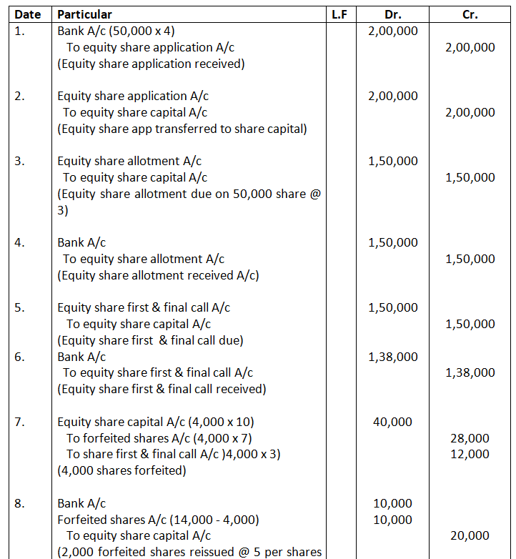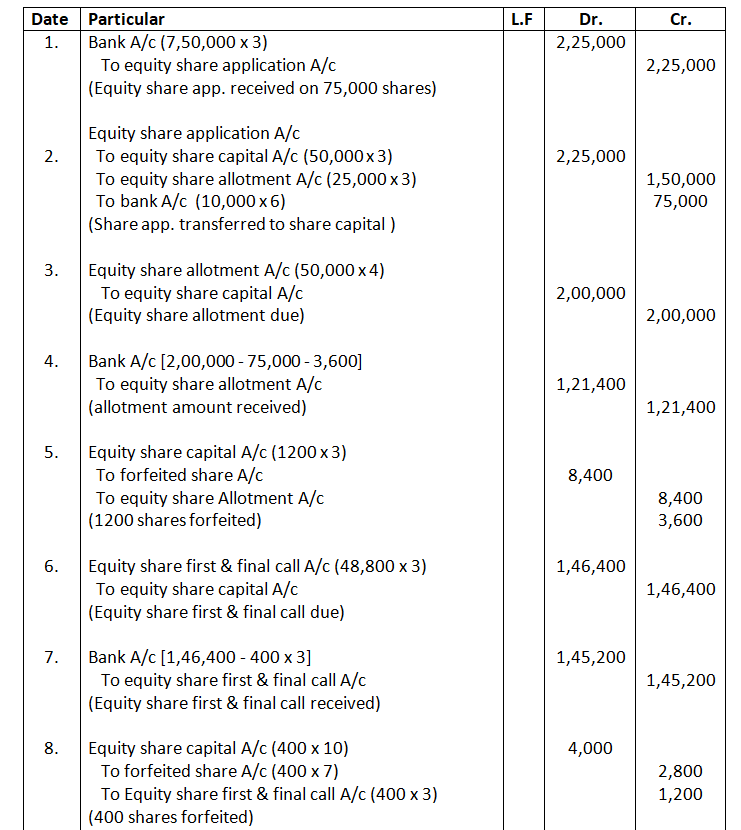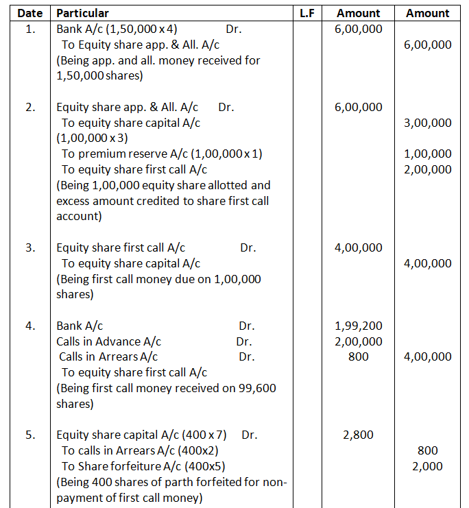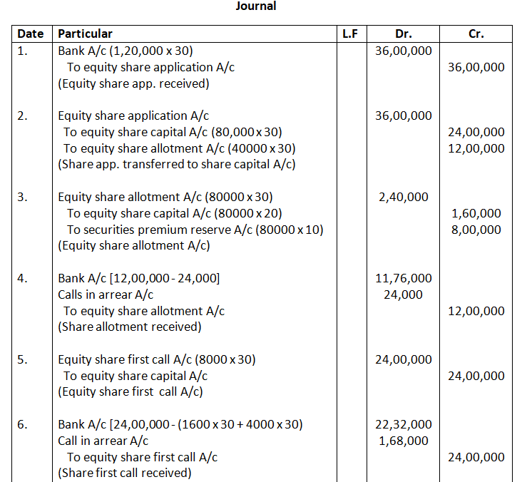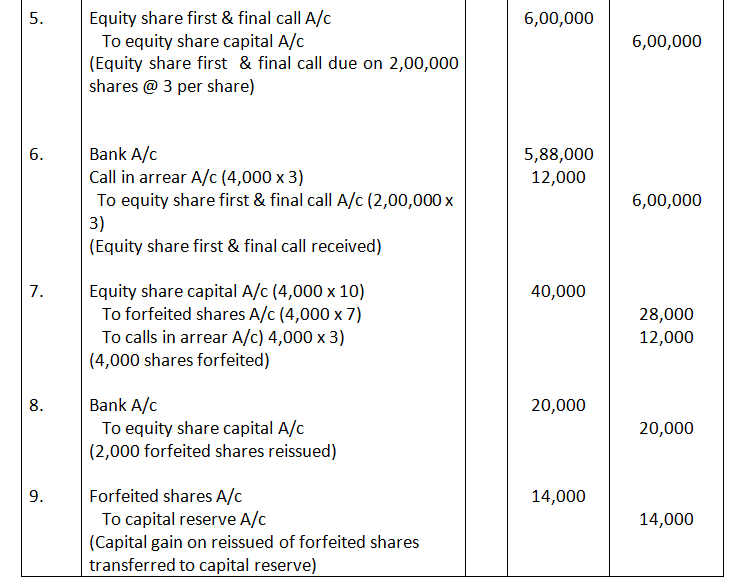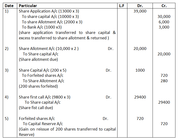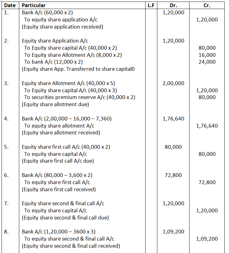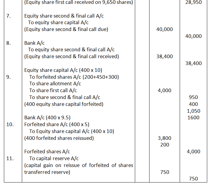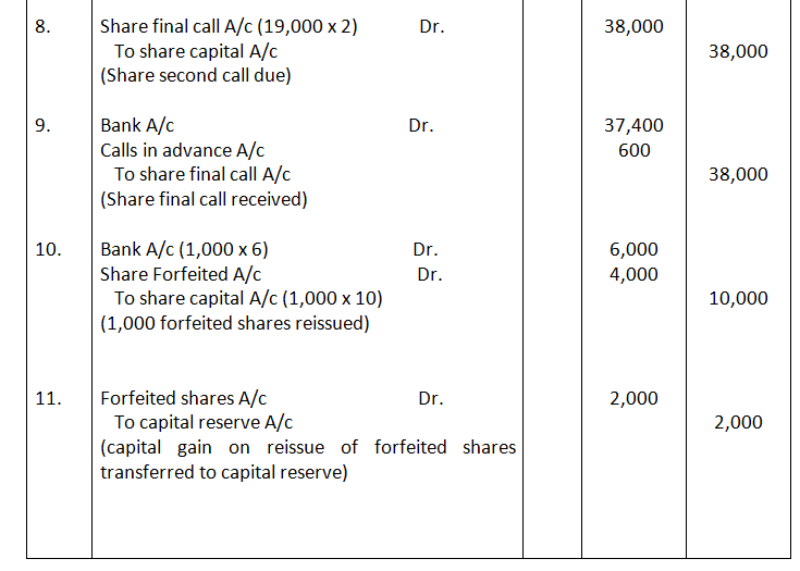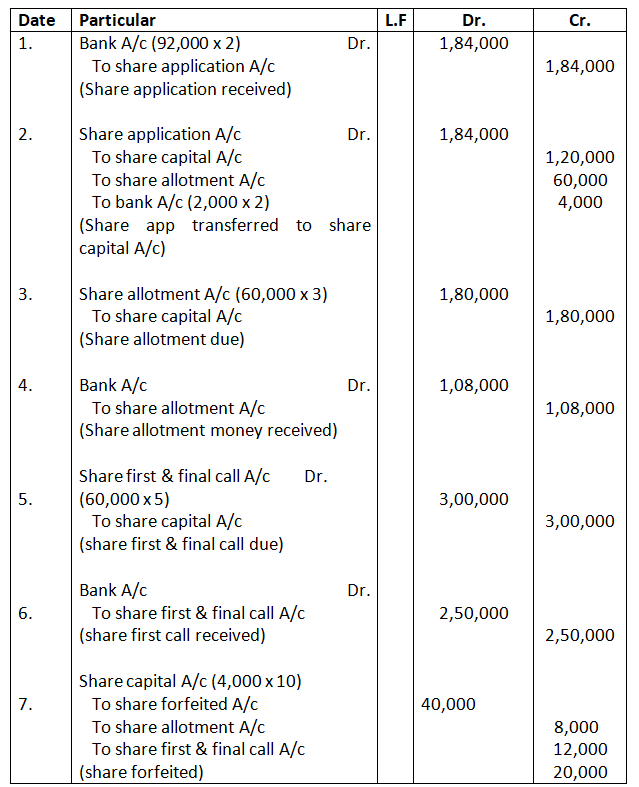 1. 2. 3. 4. 5. 6. 7. 8. 9. | Bank A/c (1,80,000 x 6) To equity share application A/c (Equity share app. received) Equity share application A/c To equity share capital A/c (1,60,000 x 5) To equity share premium reserve (1,60,000 x 1) To equity share allotment A/c (10,000 x 6) To bank A/c (10,000 x 6) (Share app. transferred to share capital A/c) Equity share allotment A/c (1,60,000 x 3) To equity share capital A/c (1,60,000 x 2) To securities premium reserve A/c (1,60,000 x 1) (Equity share allotment due on 1,60,000 shares) Bank A/c [4,80,000 – 60,000 – 8,400] To equity share allotment A/c (Equity Share allotment received) Equity share first & final call A/c (1,60,000 x 4) To equity share capital A/c (1,60,000 x 3) To security premium reserve A/c (1,60,000 x 1) (Equity share first & final call due) Bank A/c [6,40,000 – 3,200 x 4] To equity share first & final call A/c (Equity share first & final call received) Equity share capital A/c (3,200 x 10) Securities premium reserve A/c (3,200 x 2) To forfeited share A/c To equity share allotment A/c To equity share first & final call (3200 x 2) (3200 shares forfeited) Bank A/c To equity share capital A/c (1600 x 10) To securities premium reserve A/c (1,600 forfeited shares reissued) Forfeited shares A/c To capital reserve A/c (Capital gain on reissue of forfeited shares transferred to capital reserve) [ | 10,80,000 10,80,000 4,80,000 4,11,600 6,40,000 6,27,200 32000 6,400 43,000 8,600 | 10,80,000 8,00,000 1,60,000 60,000 60,000 3,20,000 1,60,000 4,11,600 4,80,000 1,60,000 6,27,200 17,200 8,400 12,800 16,000 27,000 8,600 |