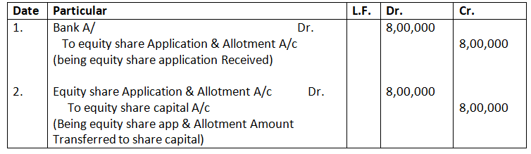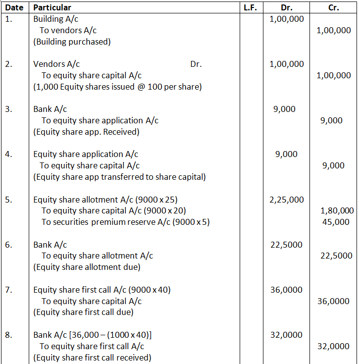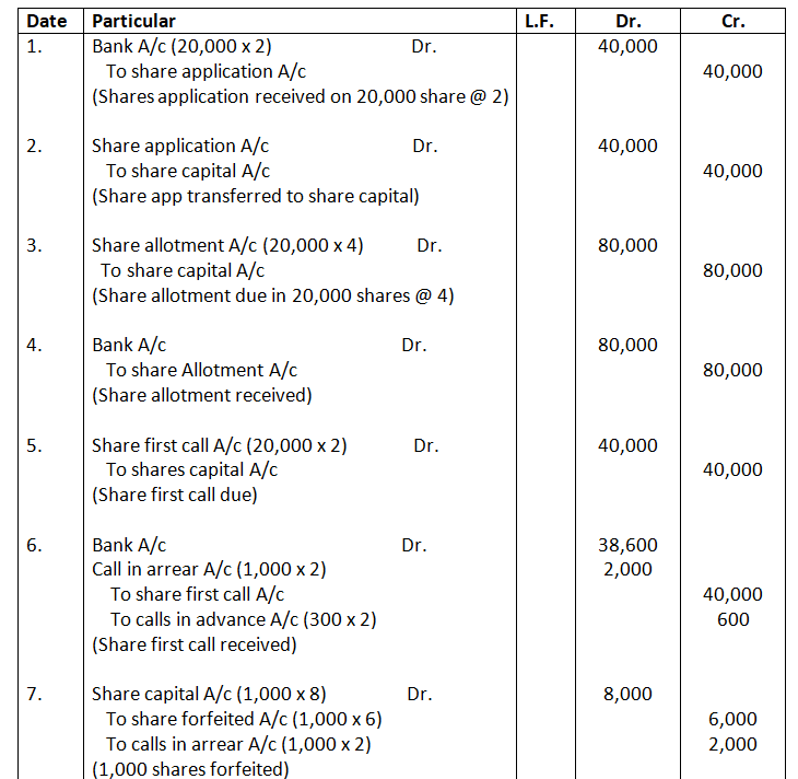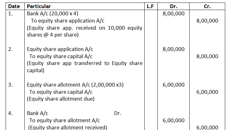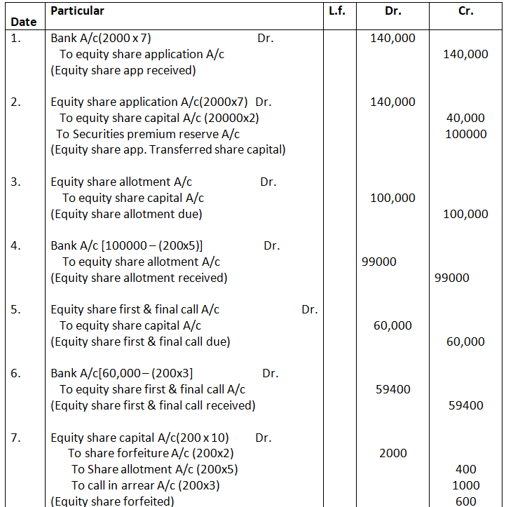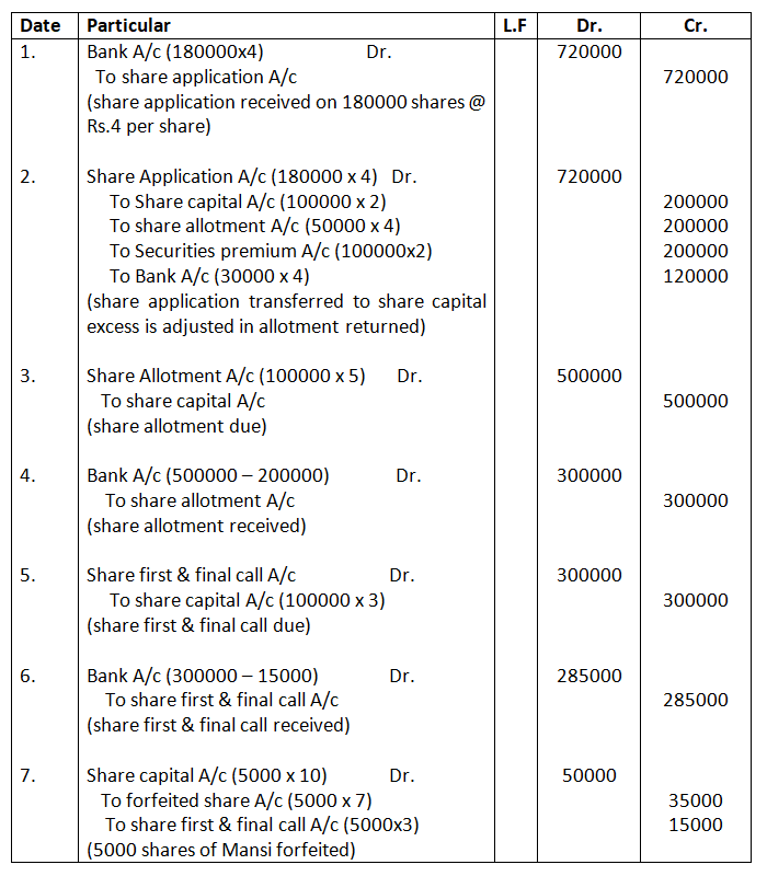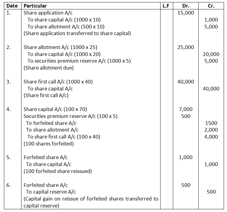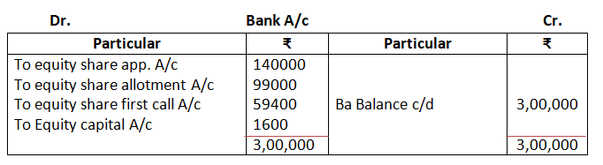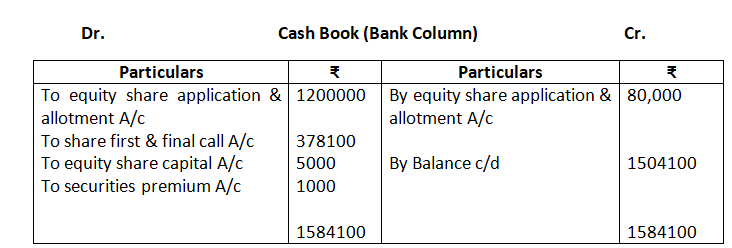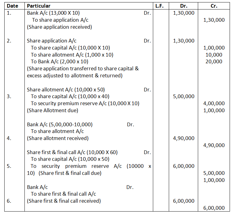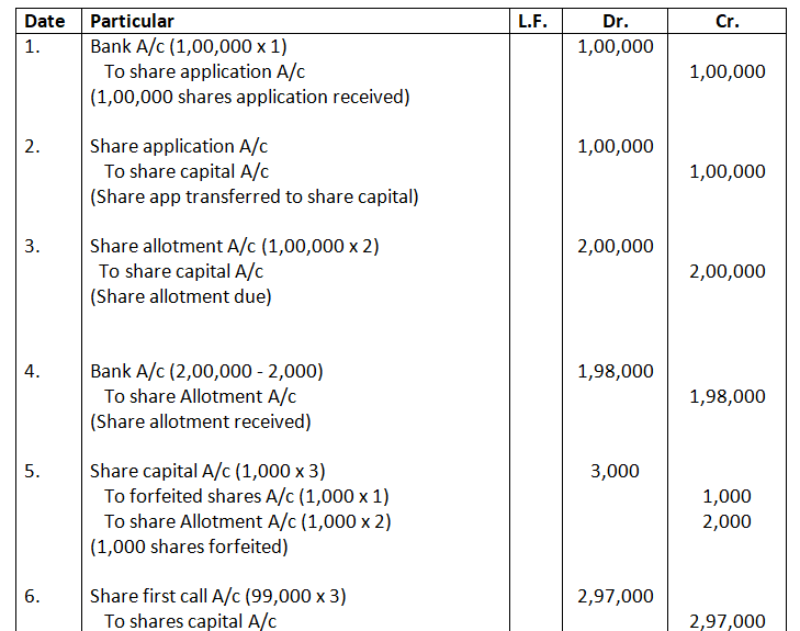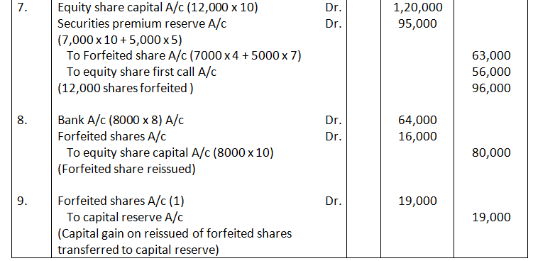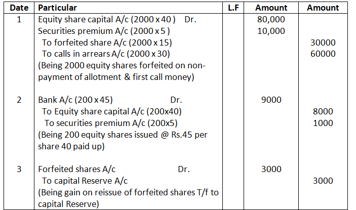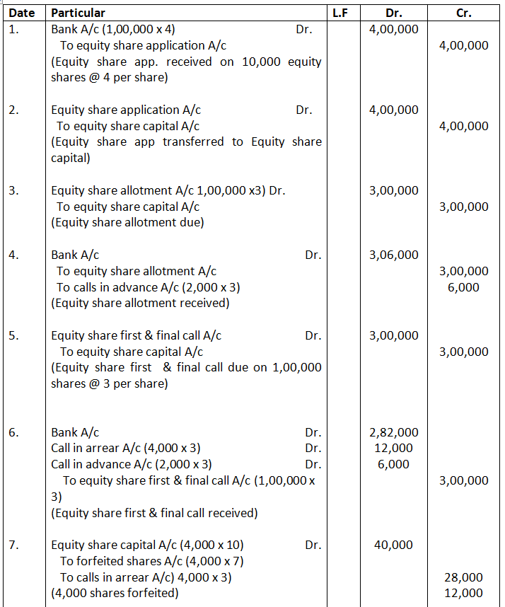 1. 2. 3. 4. 5. 6. 7. 8. 9. | Bank A/c (1,80,000 x 6) To equity share application A/c (Equity share app. received) Equity share application A/c To equity share capital A/c (1,60,000 x 5) To equity share premium reserve (1,60,000 x 1) To equity share allotment A/c (10,000 x 6) To bank A/c (10,000 x 6) (Share app. transferred to share capital A/c) Equity share allotment A/c (1,60,000 x 3) To equity share capital A/c (1,60,000 x 2) To securities premium reserve A/c (1,60,000 x 1) (Equity share allotment due on 1,60,000 shares) Bank A/c [4,80,000 – 60,000 – 8,400] To equity share allotment A/c (Equity Share allotment received) Equity share first & final call A/c (1,60,000 x 4) To equity share capital A/c (1,60,000 x 3) To security premium reserve A/c (1,60,000 x 1) (Equity share first & final call due) Bank A/c [6,40,000 – 3,200 x 4] To equity share first & final call A/c (Equity share first & final call received) Equity share capital A/c (3,200 x 10) Securities premium reserve A/c (3,200 x 2) To forfeited share A/c To equity share allotment A/c To equity share first & final call (3200 x 2) (3200 shares forfeited) Bank A/c To equity share capital A/c (1600 x 10) To securities premium reserve A/c (1,600 forfeited shares reissued) Forfeited shares A/c To capital reserve A/c (Capital gain on reissue of forfeited shares transferred to capital reserve) [ | 10,80,000 10,80,000 4,80,000 4,11,600 6,40,000 6,27,200 32000 6,400 43,000 8,600 | 10,80,000 8,00,000 1,60,000 60,000 60,000 3,20,000 1,60,000 4,11,600 4,80,000 1,60,000 6,27,200 17,200 8,400 12,800 16,000 27,000 8,600 |