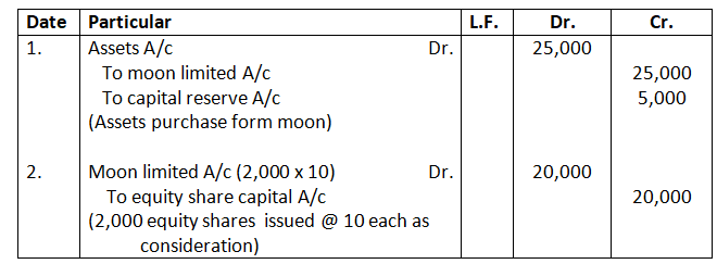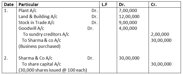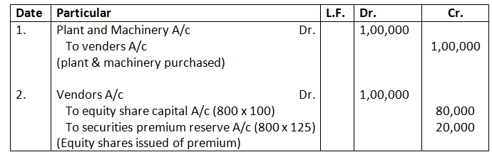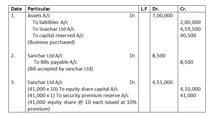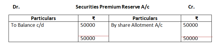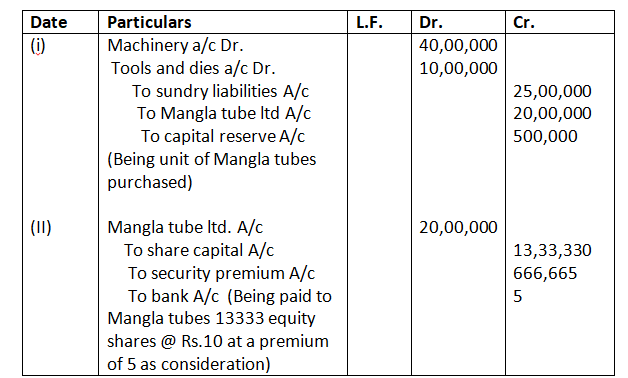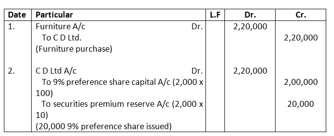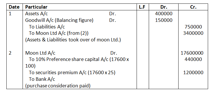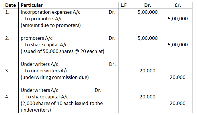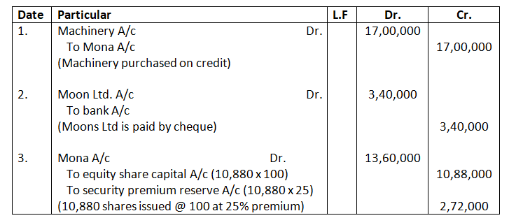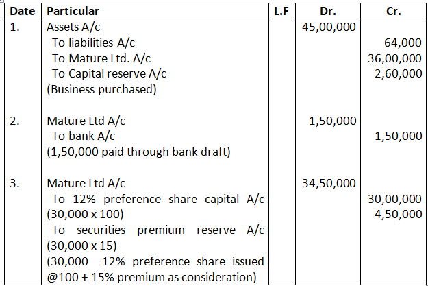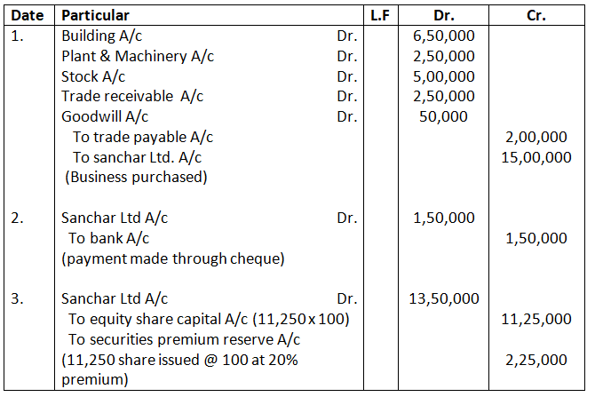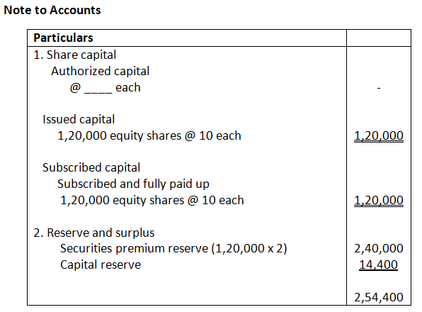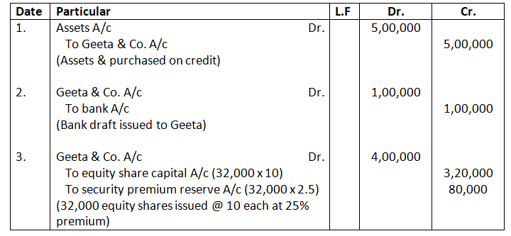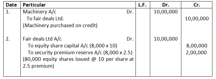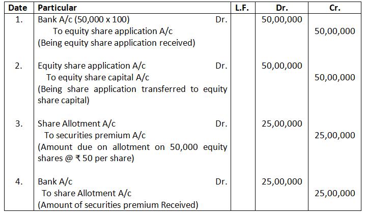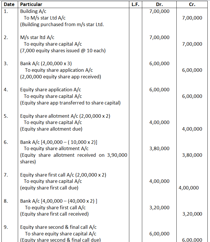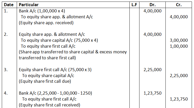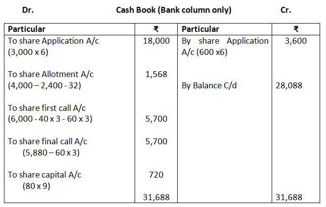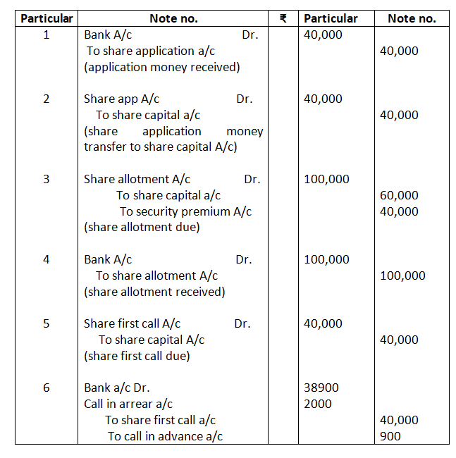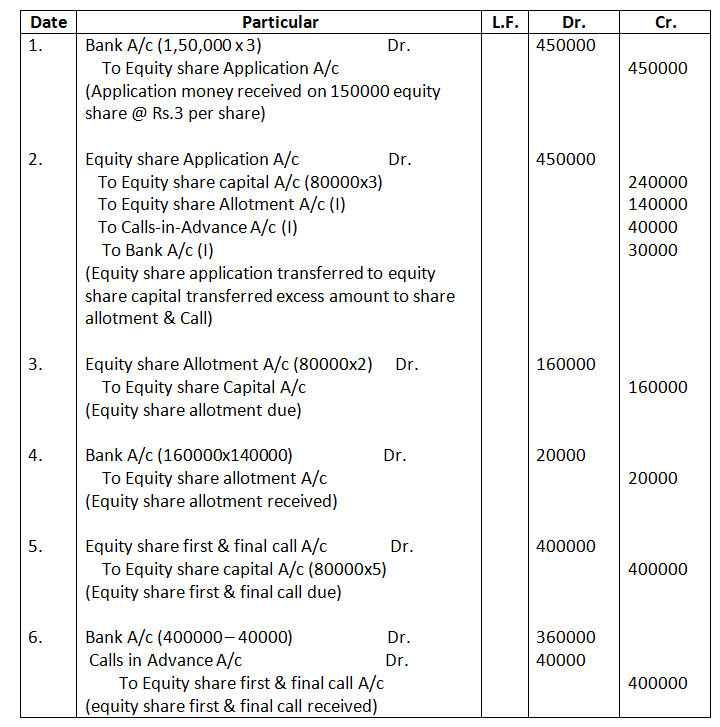 1. 2. 3. 4. 5. 6. 7. 8. 9. | Bank A/c (1,80,000 x 6) To equity share application A/c (Equity share app. received) Equity share application A/c To equity share capital A/c (1,60,000 x 5) To equity share premium reserve (1,60,000 x 1) To equity share allotment A/c (10,000 x 6) To bank A/c (10,000 x 6) (Share app. transferred to share capital A/c) Equity share allotment A/c (1,60,000 x 3) To equity share capital A/c (1,60,000 x 2) To securities premium reserve A/c (1,60,000 x 1) (Equity share allotment due on 1,60,000 shares) Bank A/c [4,80,000 – 60,000 – 8,400] To equity share allotment A/c (Equity Share allotment received) Equity share first & final call A/c (1,60,000 x 4) To equity share capital A/c (1,60,000 x 3) To security premium reserve A/c (1,60,000 x 1) (Equity share first & final call due) Bank A/c [6,40,000 – 3,200 x 4] To equity share first & final call A/c (Equity share first & final call received) Equity share capital A/c (3,200 x 10) Securities premium reserve A/c (3,200 x 2) To forfeited share A/c To equity share allotment A/c To equity share first & final call (3200 x 2) (3200 shares forfeited) Bank A/c To equity share capital A/c (1600 x 10) To securities premium reserve A/c (1,600 forfeited shares reissued) Forfeited shares A/c To capital reserve A/c (Capital gain on reissue of forfeited shares transferred to capital reserve) [ | 10,80,000 10,80,000 4,80,000 4,11,600 6,40,000 6,27,200 32000 6,400 43,000 8,600 | 10,80,000 8,00,000 1,60,000 60,000 60,000 3,20,000 1,60,000 4,11,600 4,80,000 1,60,000 6,27,200 17,200 8,400 12,800 16,000 27,000 8,600 |