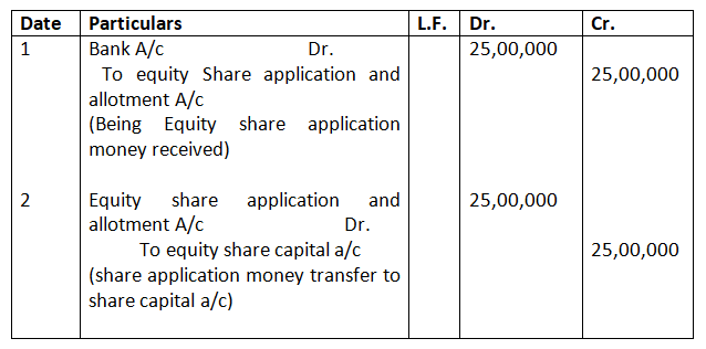 11. Global sales Ltd. issued 2,50,000 equity shares of 10 each to public at par for subscription, amount being payable as application money. Pass necessary journal entries in the books of the company.