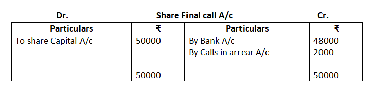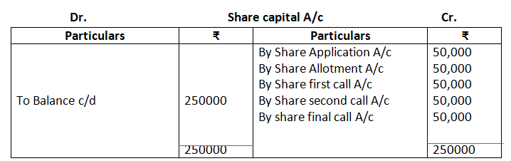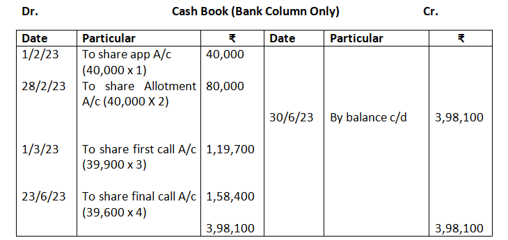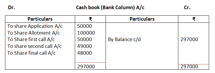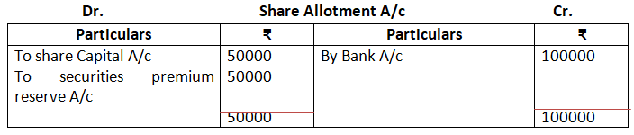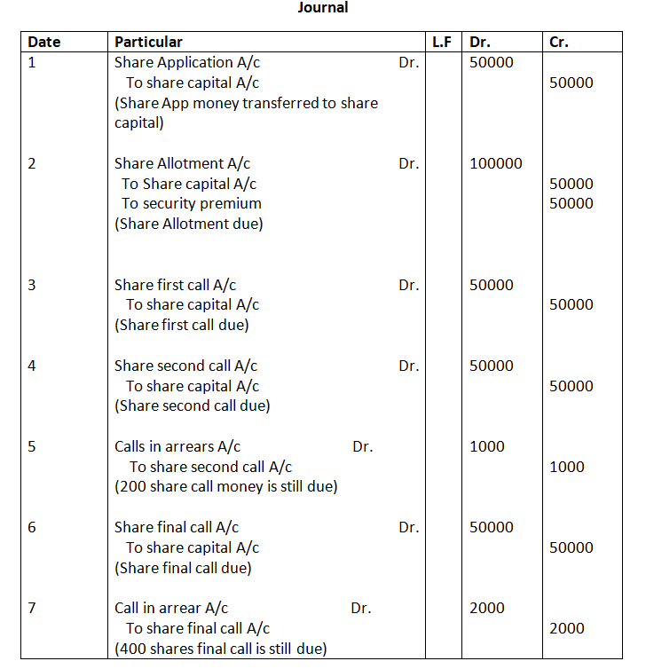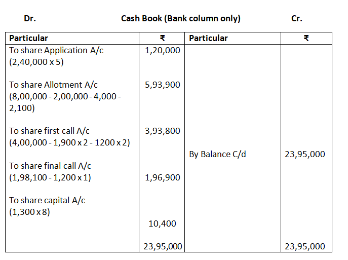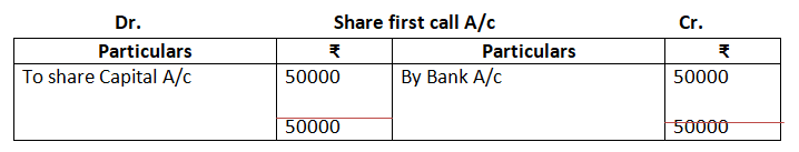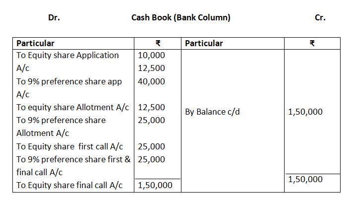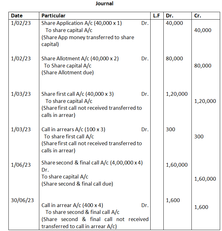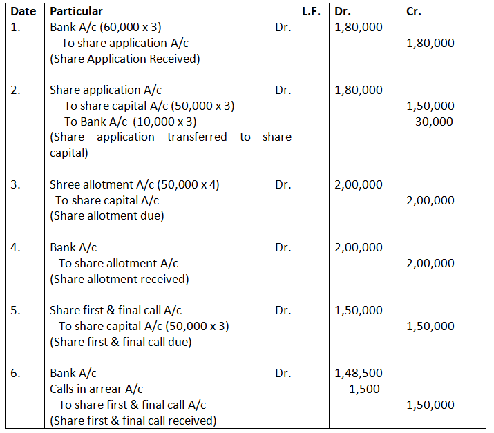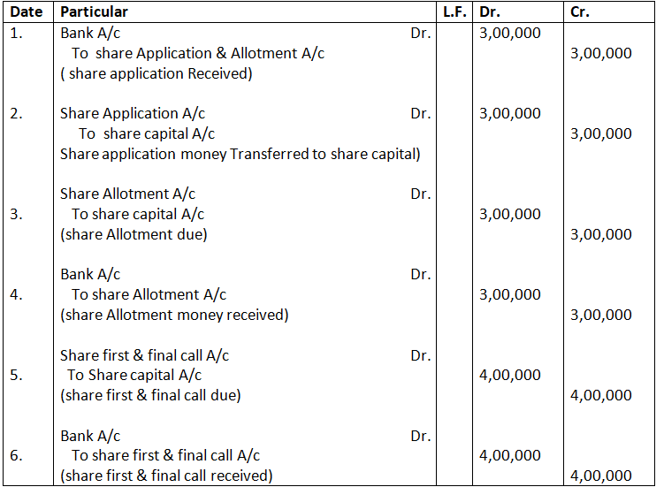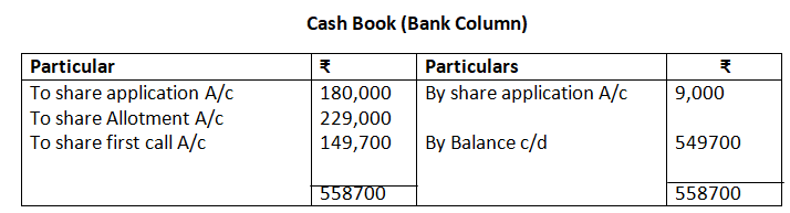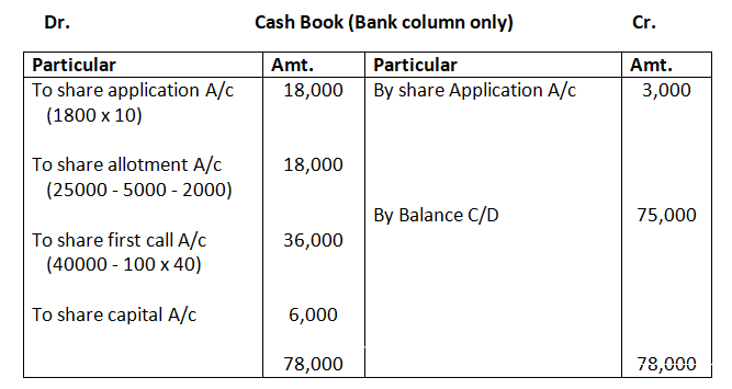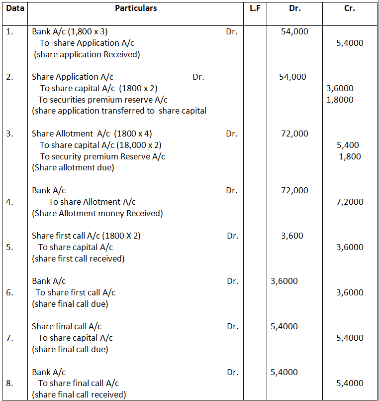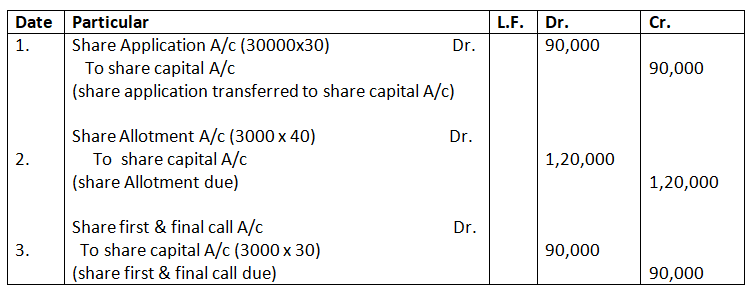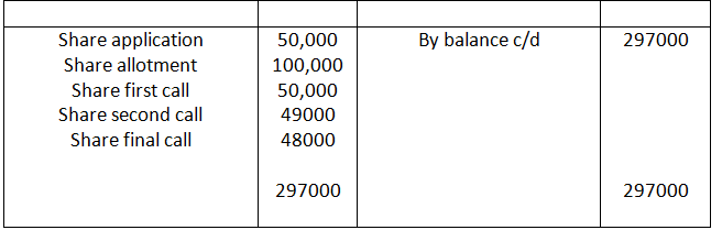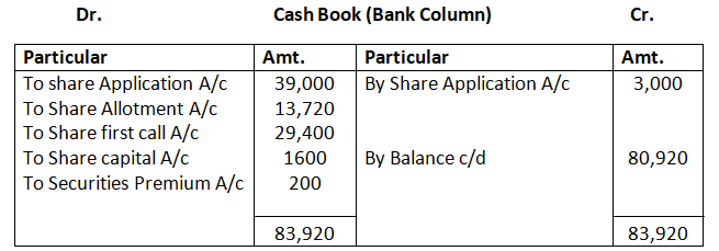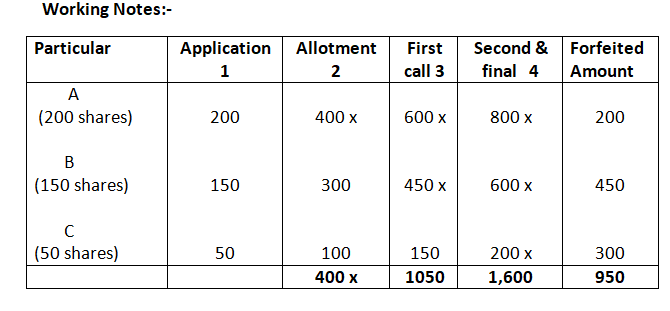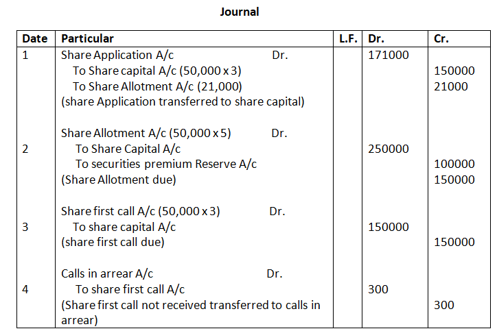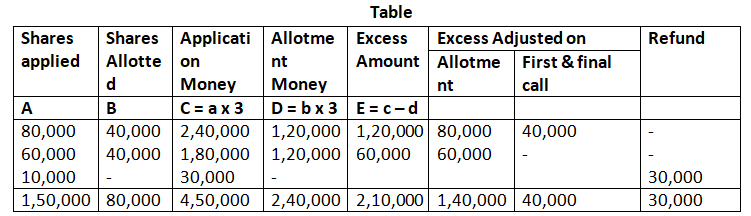 ₹ 50 per share on application, ₹ 40 per share on allotment (including premium), ₹ 30 per share on first call and balance on final call. Public applied for 14,000 shares. All the money as was duly received.