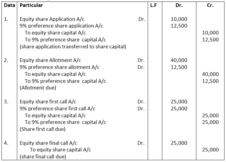15. Modern Diaries Ltd. Was registered with an authorized capital of ₹ 10,00,000 divided into 7,500 equity shares of ₹ 100 each and 2,500 preference shares of ₹ 100 each 1,000 equity shares and 500; 9% preference shares were offered to public on the following terms – equity shares payable ₹ 10 on application, ₹ 40 on allotment and the balance in two calls of ₹ 25 each. Preference shares are payable and final call. All the shares were applied for and allotted. Amount due was duly received.