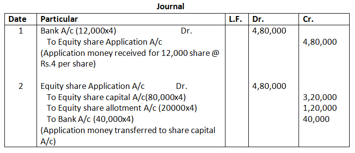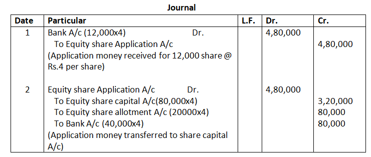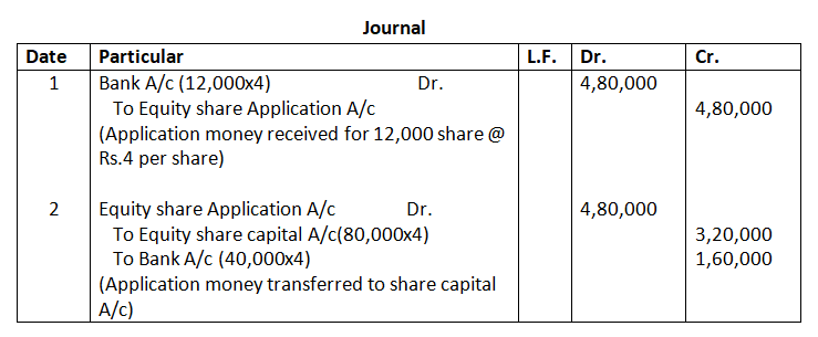 19. Bright ltd. issued 80,000 equity shares of 10 each against which it received application for 1,20,000 shares. Application money was 4, allotment money and first and final call was of 3 each.