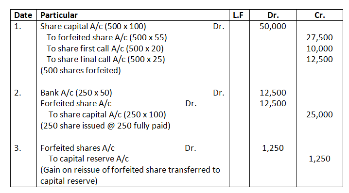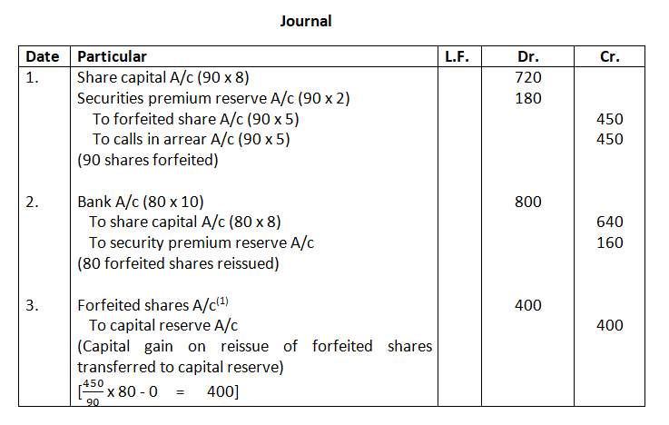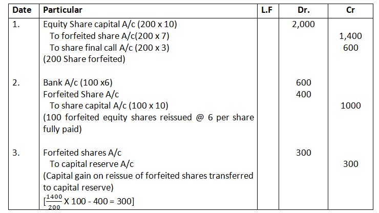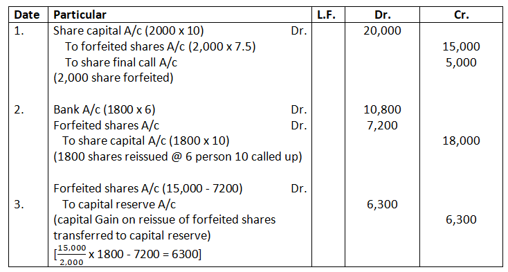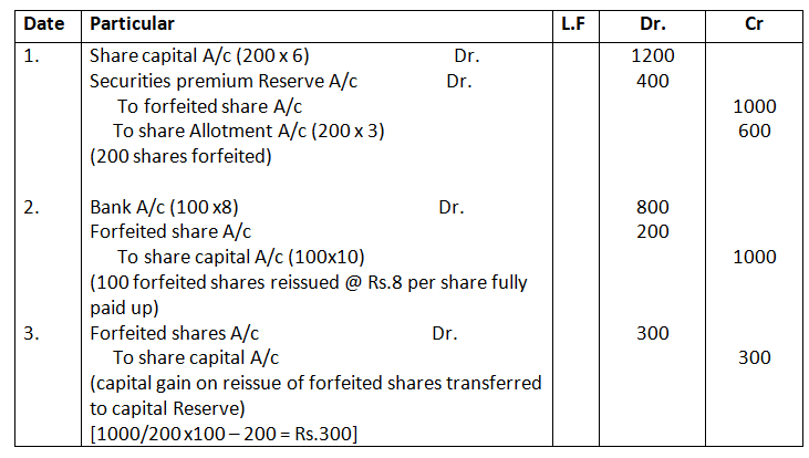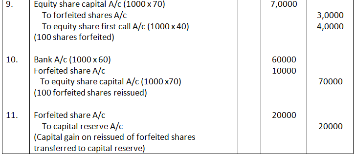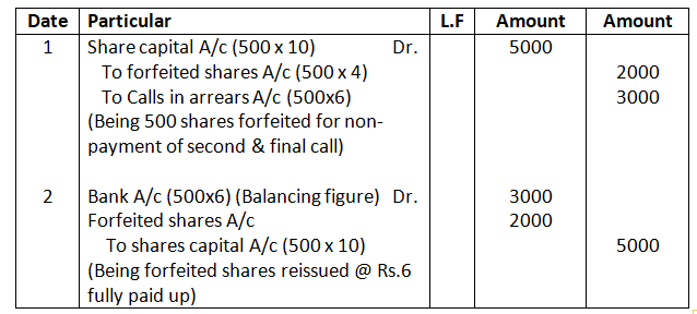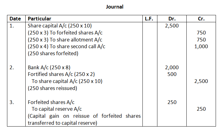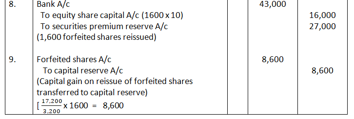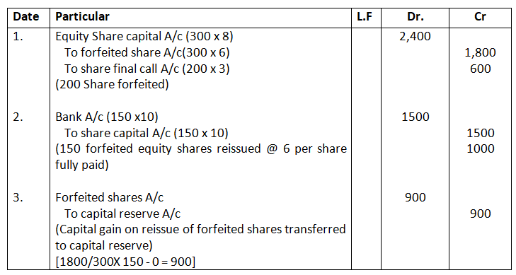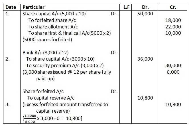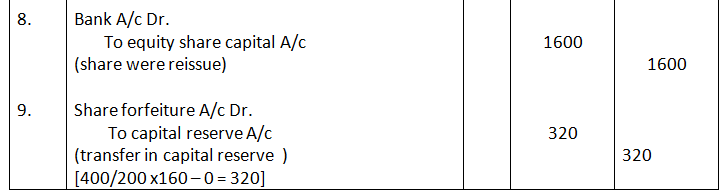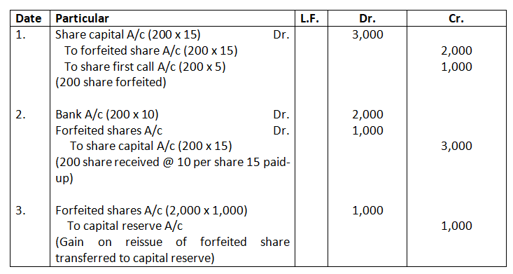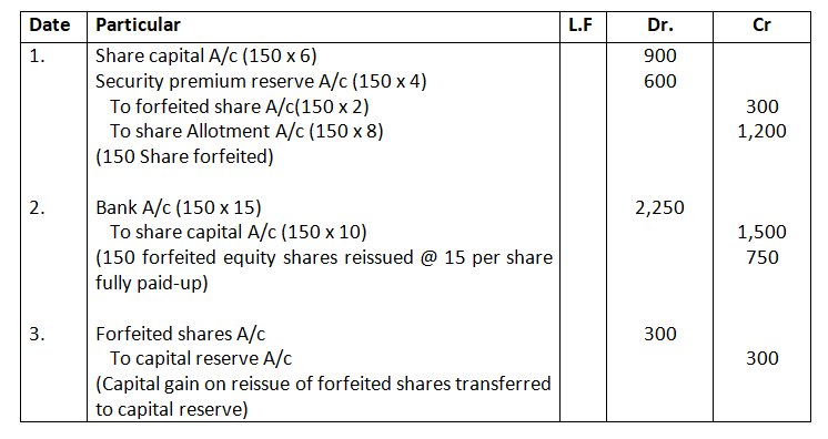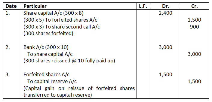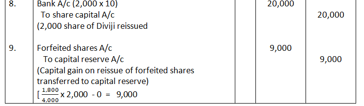 Divij’s shares were forfeited after the first and final call. Half of the forfeited shares were reissued @ 10 per share fully paid.