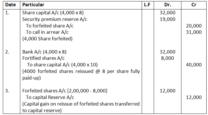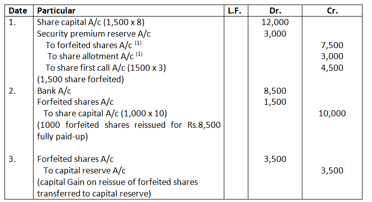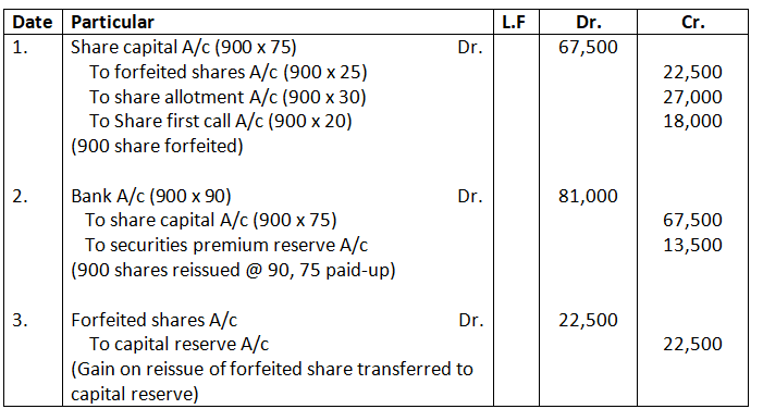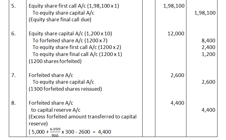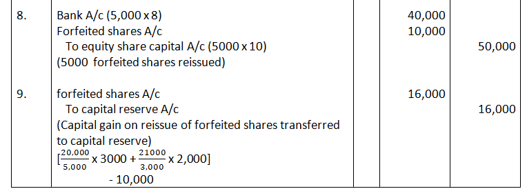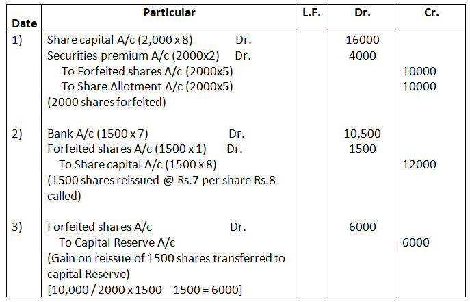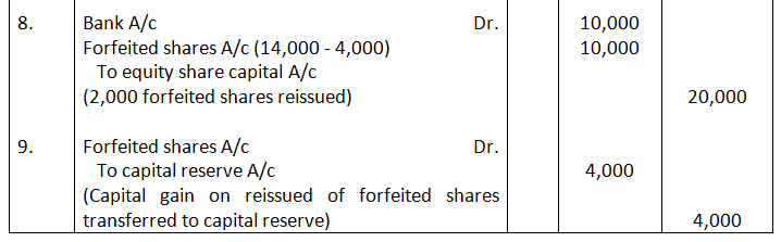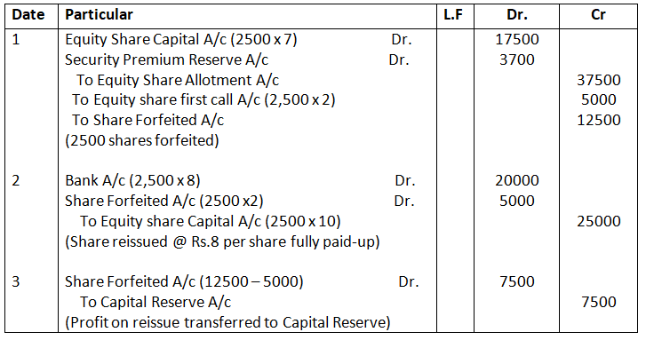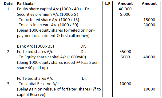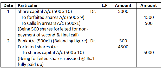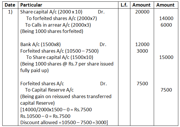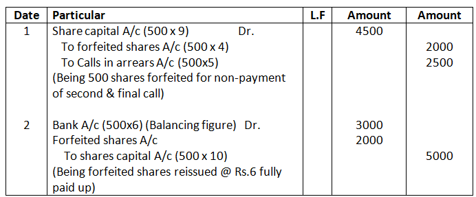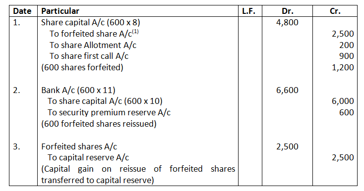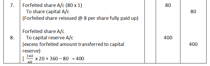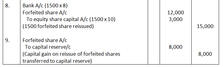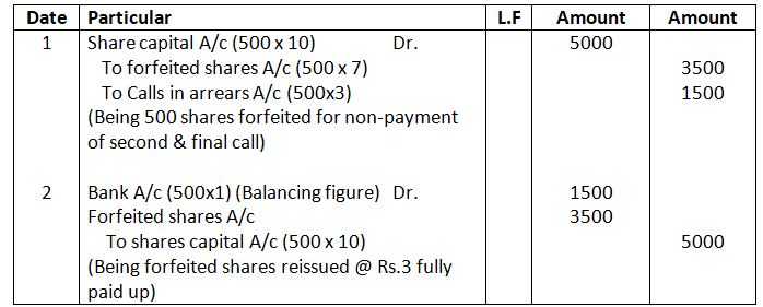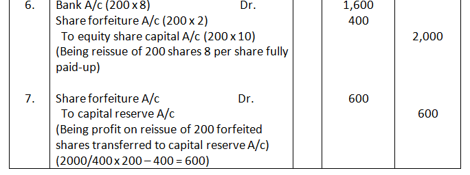 Shamu, who had applied for 700 shares out of the group for 35,000 shares, failed to pay the first and final call. His shares were also forfeited shares, 1,000 were reissued @ 8 per share as fully paid-up. The reissued shares included all the forfeited shares of Shamu.