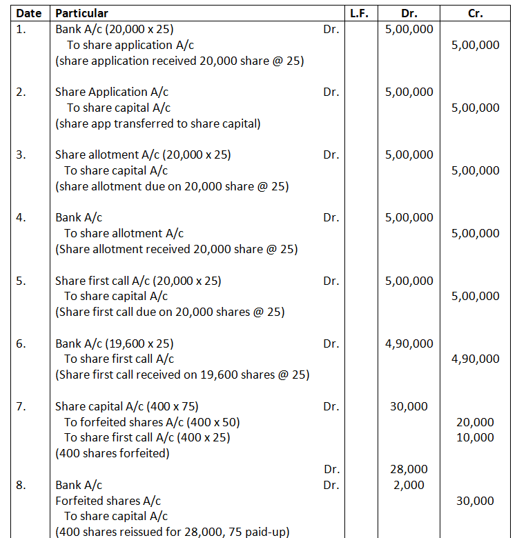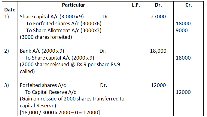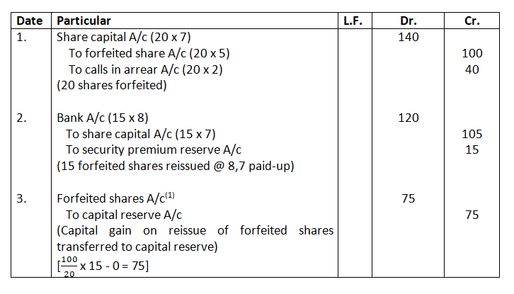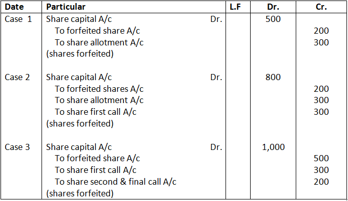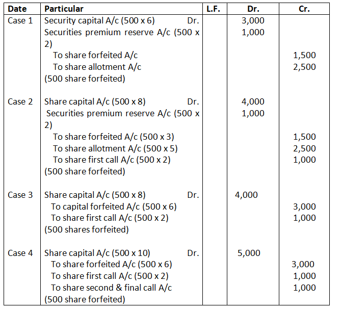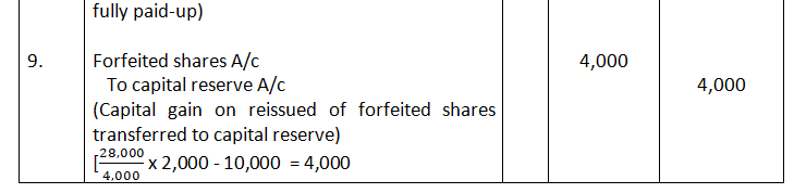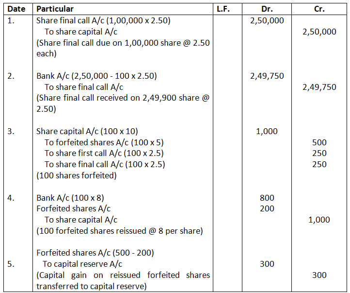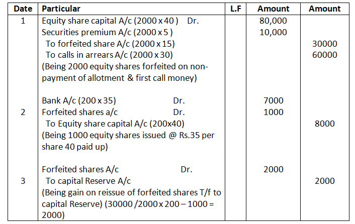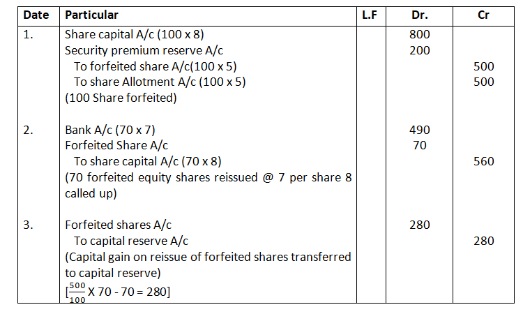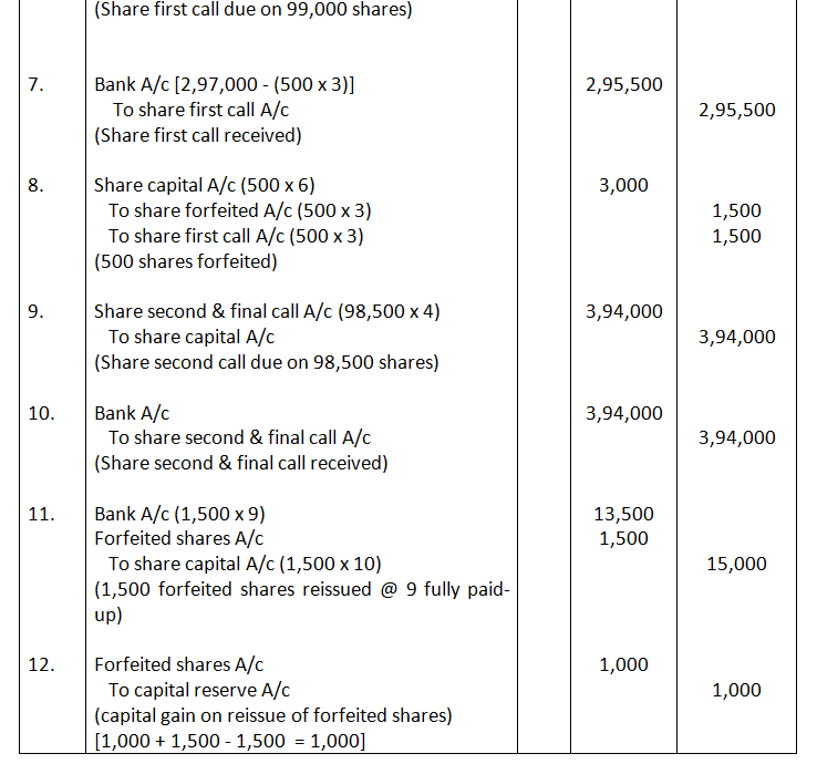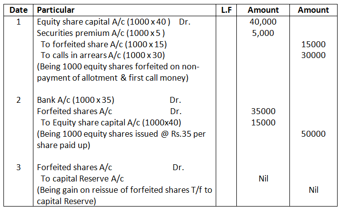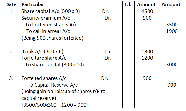 Shamu, who had applied for 700 shares out of the group for 35,000 shares, failed to pay the first and final call. His shares were also forfeited shares, 1,000 were reissued @ 8 per share as fully paid-up. The reissued shares included all the forfeited shares of Shamu.