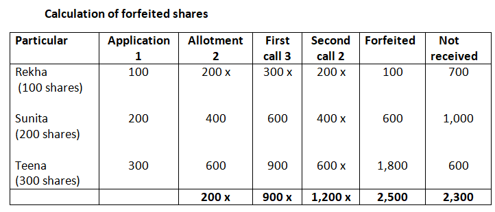 Applicants of 1,000 shares falling in category (i) and application of 1,200 shares falling in category (ii) failed to pay allotment money. These share were forfeited on failure to pay first call. Holders of 1,200 shares failing in category (iii) failed to pay the first and final call and these shares forfeited after final call.