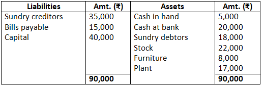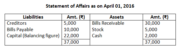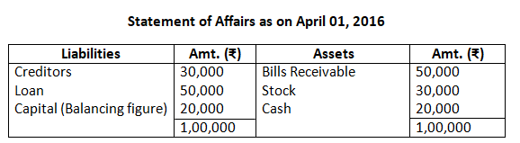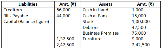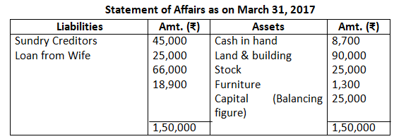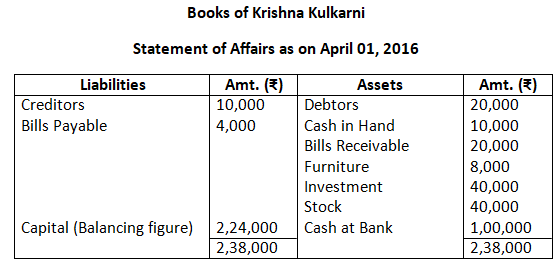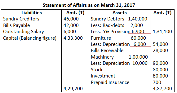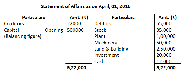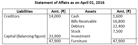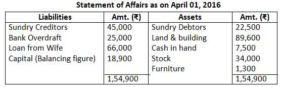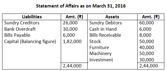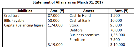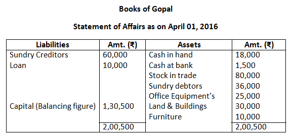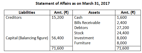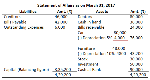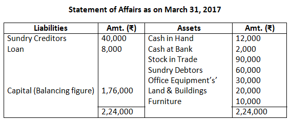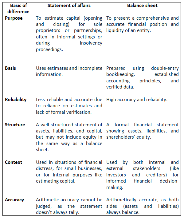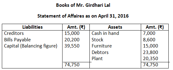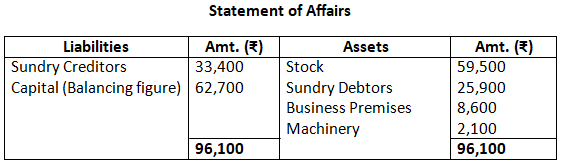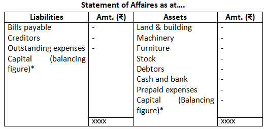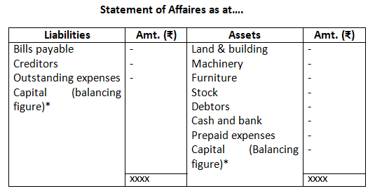 Ans. A statement is known as statement of affairs, shows assets on one side and the liabilities on the other just as in case of a balance sheet. The difference between the totals of the two sides is the capital. Though statement of affairs resembles balance sheet it is not called a balance sheet because the data is not wholly based on ledger balance. The amount of items like fixed assets, outstanding expenses, bank balances, etc. are ascertained from the relevant document and physical counts.