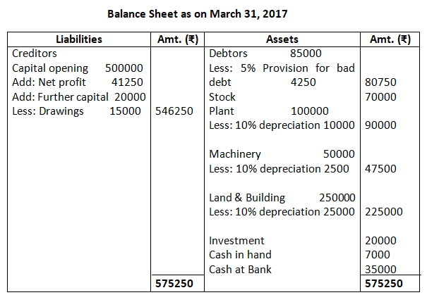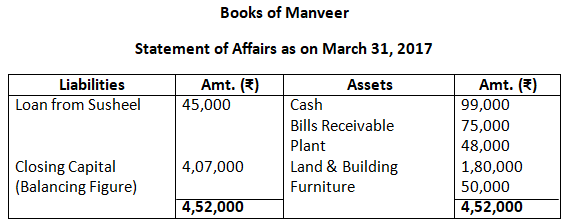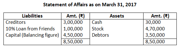 2. Manveer started his business on April 01, 2016 with a capital of Rs.4,50,000. On March 31, 2017 his position was as under: