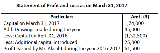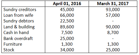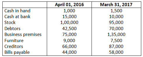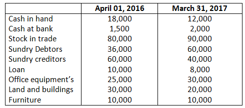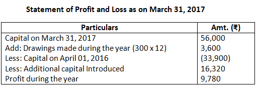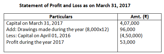 He owned Rs.45,000 from his friend Susheel on that date. He withdrew Rs.8,000 per month for his household purposes. Ascertain his profit or loss for this year ended March 31, 2017.