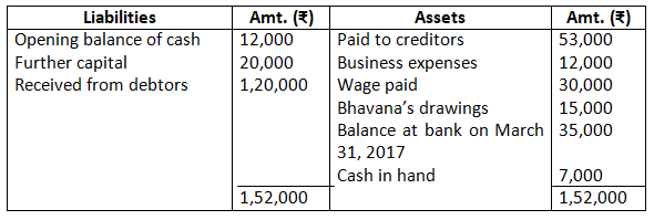 28. Mrs. Bhavana keeps his books by Single Entry System. You’re required to prepare final accounts of her business for the year ended March 31, 2017. Her records relating to cash receipts and cash payments for the above period showed the following particulars: