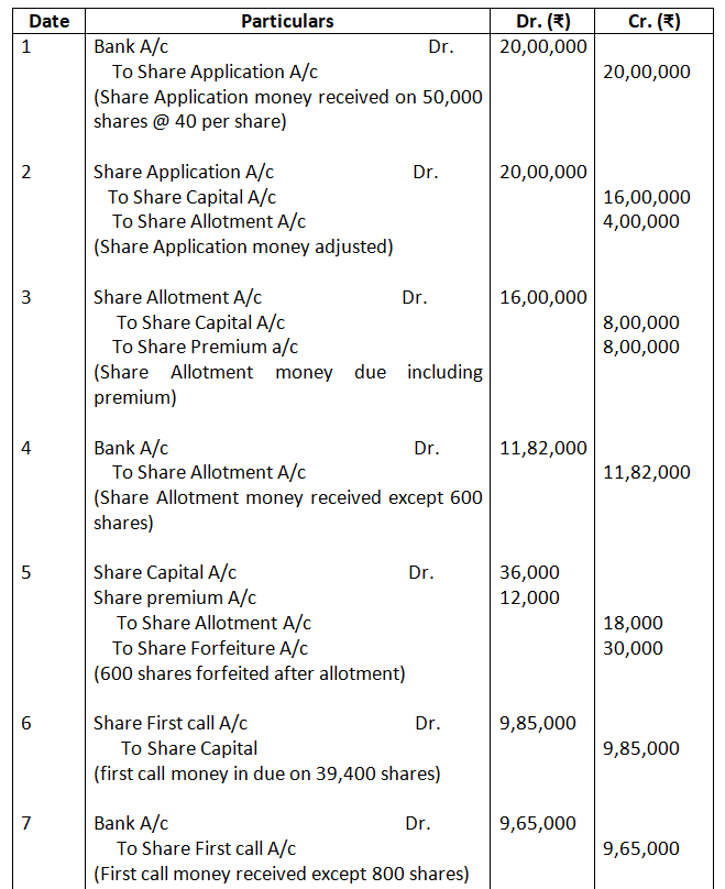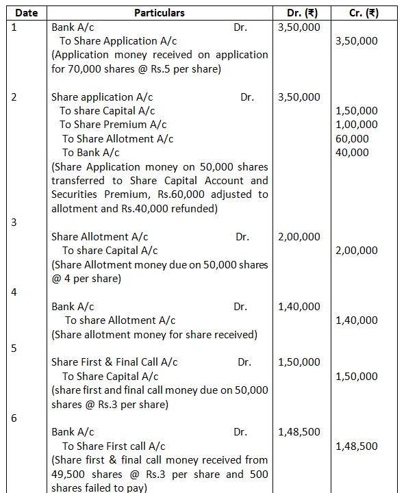 17. Life machine tools Limited, issued 50,000 equity shares of Rs.10 each at Rs.12 per share, payable at to Rs.5 on application (including premium), Rs.4 on allotment and the balance on the first and final call. Applications for 70,000 shares had been received. Of the cash received. Rs.40,000 was returned and Rs.60,000 was applied to the amount due on allotment, the balance of which was paid. All shareholders paid the call due, with the exception of one share holder of 500 shares. These shares were forfeited and reissued as fully paid at Rs.8 per share. Journalese the transactions.