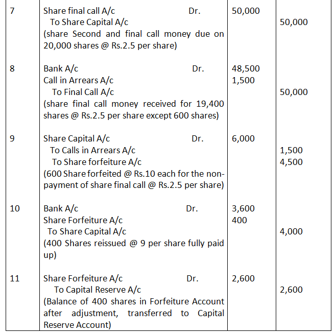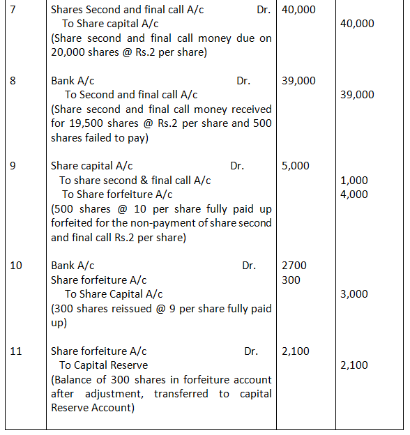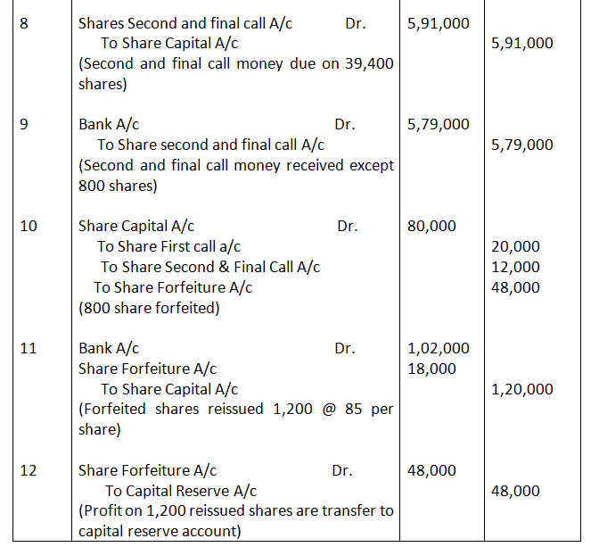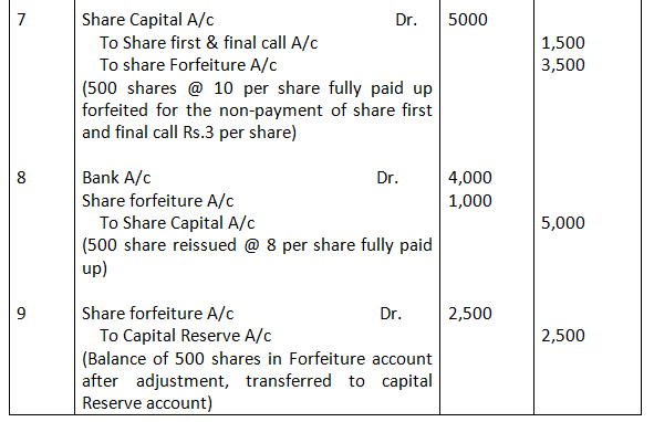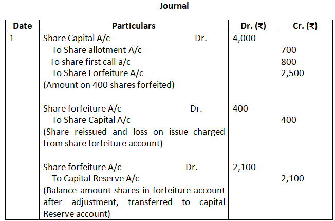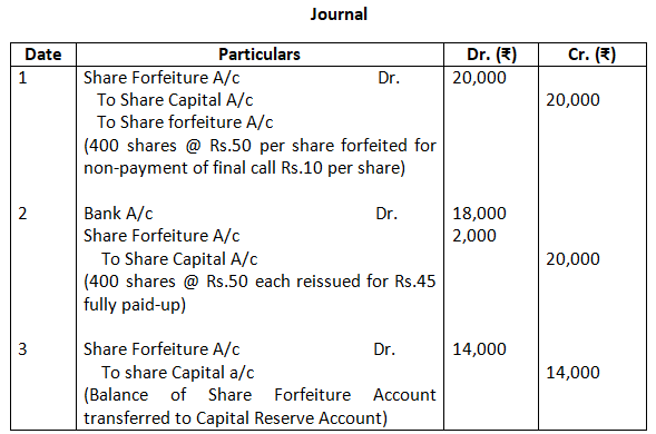 c. 400 share of Rs.50 each issued at per were forfeited for non-payment of final call of Rs.10 per share. These share were reissued at Rs.45 per share fully paid-up.