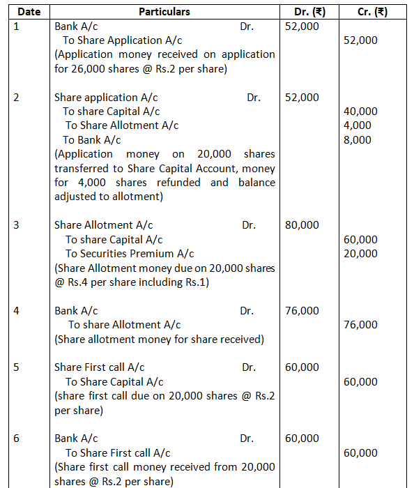 6. A limited company offered for subscription of 1,00,000 equity shares of Rs.10 each at a premium of Rs.2 per share 2,00,000. 10% Preference shares of Rs.10 each at par.