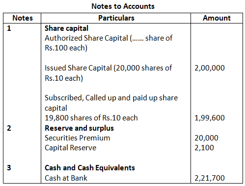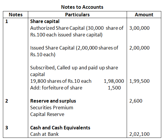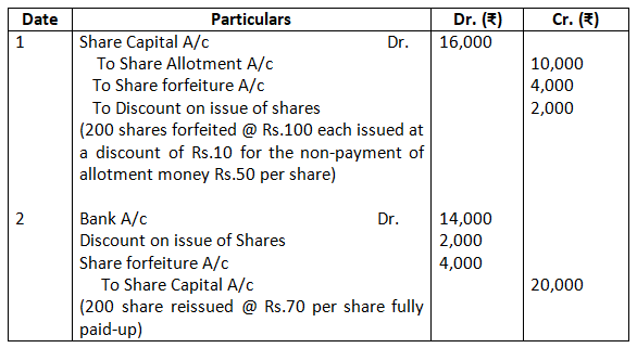 a. 200 shares of Rs.100 each issued at a discount of Rs.10 were forfeited for the non-payment of allotment money of Rs.50 per share. The first and final call of Rs.20 per share on these share were not made. The forfeited share were reissued at Rs.70 per share as fully paid-up.
