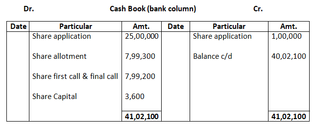 3. Software solution India Ltd. Inviting application for 20,000 equity share of Rs.100 each, payable Rs.40 on application, Rs.30 on allotment and Rs.30 on call. The company received applications for 32,000 shares. Application for 2,000 shares were rejected and money returned to Applicants. Applications for 10,000 shares were accepted in full and applicants for 20,000 share allotted half of the number of shared applied and excess application money adjusted into allotment. All money received due on allotment and call. Prepare journal and cash book.