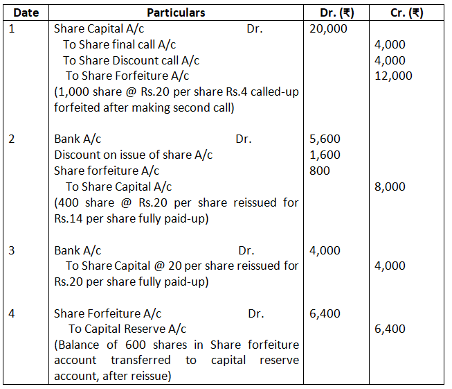 20. Ashoka Limited Company which had issued equity shares of Rs.20 each at a discount of Rs.4 per share, forfeited 1,000 shares for non-payment of final call of Rs.4 per share. 400 of the forfeited shares are reissued at Rs.14 per share out of the remaining shares of 200 shares reissued at Rs.20 per share. Give journal entires for the forfeiture and reissue of shares and show the amount transferred to capital reserve and the balance in Share Forfeiture Account.