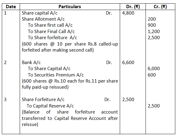 Rohan, whom 4,800 shares were allotted, failed to pay for the two calls. These shares were subsequently forfeited after the second call was made. All the shares forfeited were reissued to Teena as fully paid at Rs.7 per share.