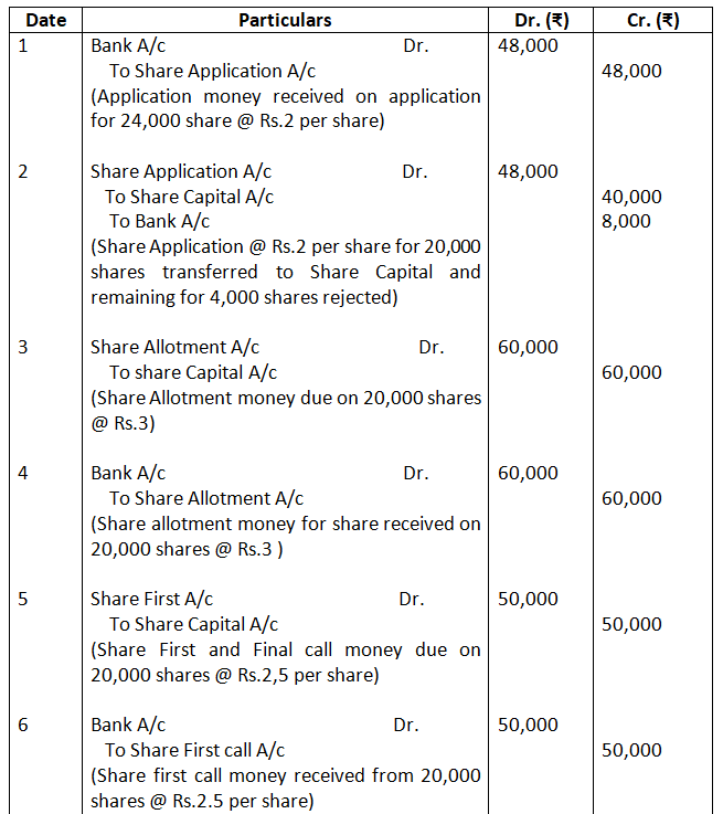 5. Mohit Glass Ltd. Issued 20,000 shares of Rs.100 each at Rs.110 per share, payable Rs.30 on application, Rs.40 on allotment (including Premium), Rs.20 on first call and Rs.20 on final call. The applications were received for Rs.24,000 shares and allotted 20,000 shares and reject 4,000 shares and amount returned thereon. The money was duly received. Give journal entries.