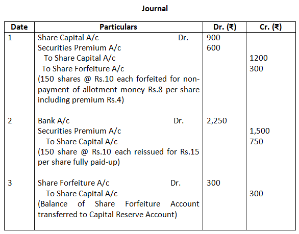 b. 150 shares of Rs.10 each issued at a premium of Rs.4 per share payable with allotment were forfeited for non-payment of allotment money of Rs.8 per share including premium. The first and final call of Rs.4 per share were not made. The forfeited share were reissued at Rs.15 per share fully paid-up.