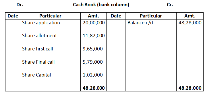 4. Rupak Ltd. Issued 10,000 shares of Rs.100 each payable Rs.20 per share on application, Rs.30 per share on allotment and balance in two calls of Rs.25 per share. The application and allotment money were duly received. On first call all member pays their dues except one member holding 200 shares, while another member holding 500 shares paid for the balance due in full. Final call was not made. Give journal entries and prepare cash book.