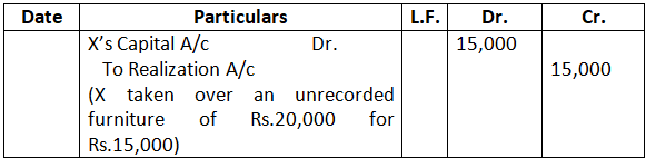 - What Journal entry will be passed when the unrecorded furniture of Rs.20,000 is taken by X, a partner at Rs.15,000 on the dissolution of the firm?