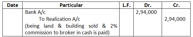 2. Land and building (Book value) ₹ 1,60,000 sold for ₹ 3,00,000 through a broker who changed 2% commission on the deal. Journalize the transaction, at the time of dissolution of the firm.