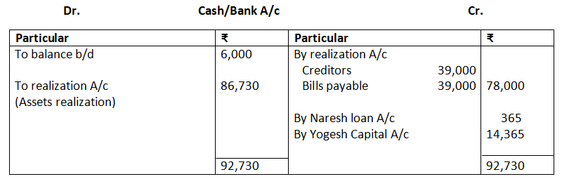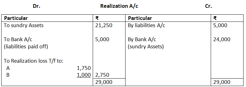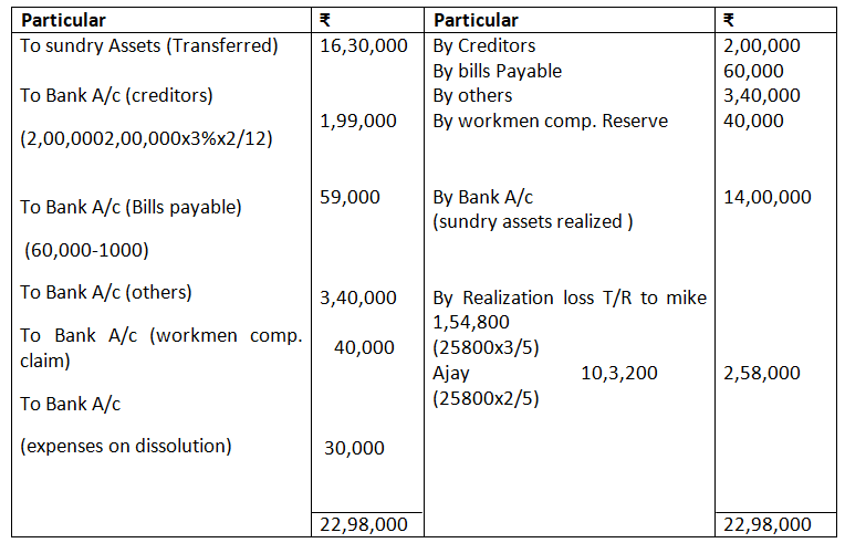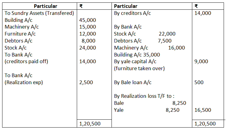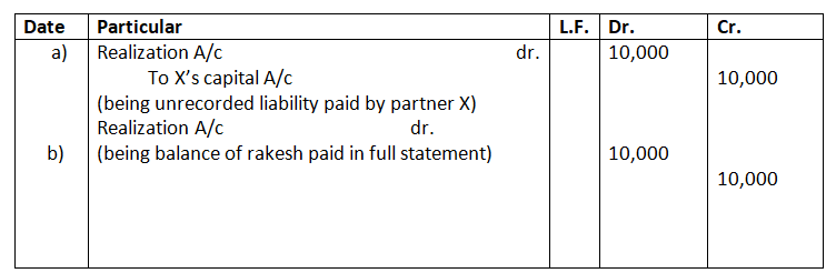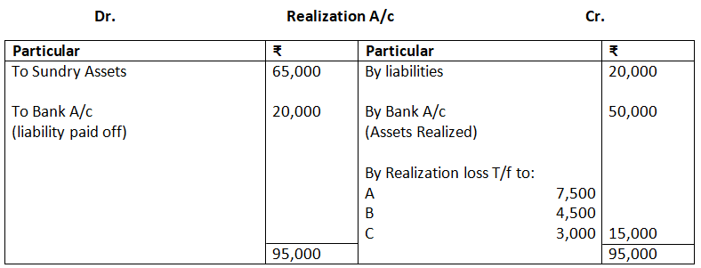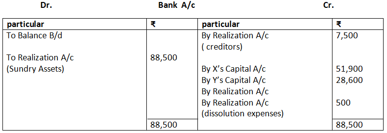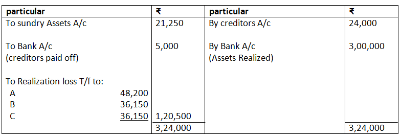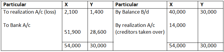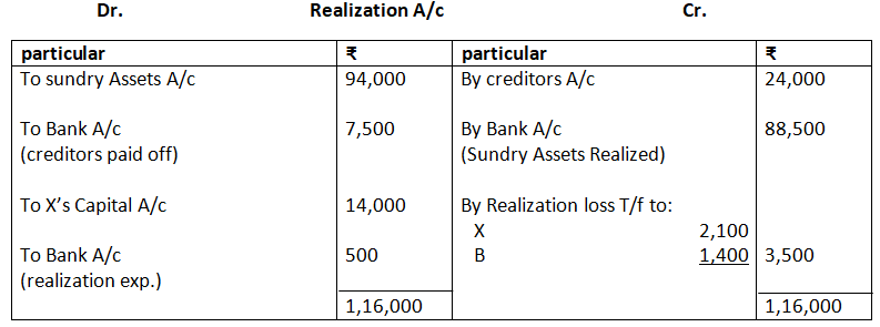 Assets were realized for ₹ 88,500. Creditors of ₹ 16,000 were taken over by X at ₹ 14,000. Remaining creditors were paid at ₹ 7,500. The cost of realization came to ₹ 500.
