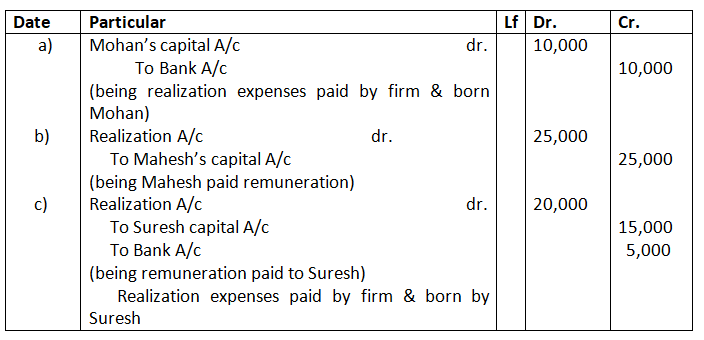 - Mohan, one of the partners of the firm, was asked to carry out dissolution of the firm for which he was allowed a salary of ₹ 20,000. Expenses for dissolution were ₹ 5,000.