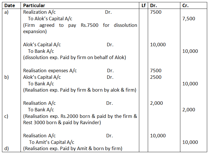 - Firm agreed to pay Alok ₹ 7,500 towards dissolution expenses. Dissolution expenses were ₹ 10,000, which were paid by the firm.