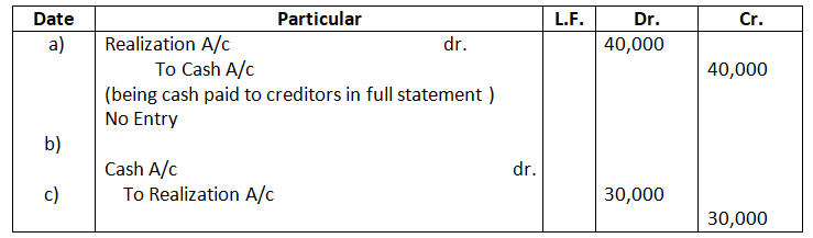 - Creditors of ₹85,000 accepted ₹40,000 in cash and Investment of ₹43,000, in full settlement of their claim.
