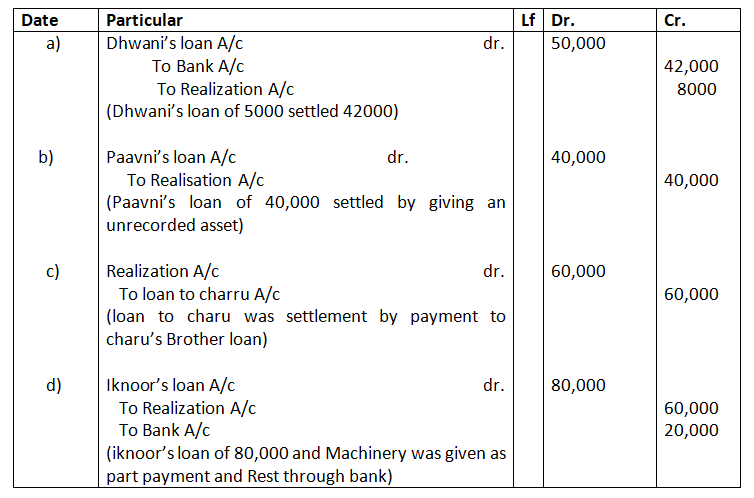 - Fixed assets realization ₹ 29,700 whereas stock and Debtors realized ₹ 80,000.