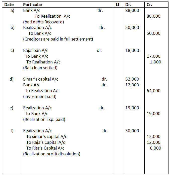 12. Simar, Raja and Rita were partners in a firm sharing Profits and losses in the ratio of 2:2:1. The firm was dissolved on 31st, March, 2019. After the transfer of assets (other then cash) and external liabilities to the Realization account, the following transactions took place: