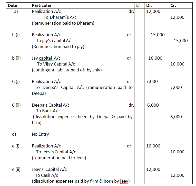 - Jay, a partner, was appointed to look after dissolution and was to be paid ₹ 15,000, including dissolution expenses. Dissolution expenses ₹ 16,000 were by Vijay, another partner on behalf of jay.