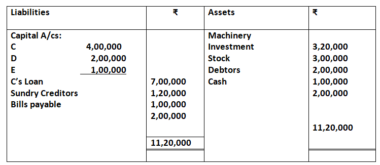 Sundry Debtors: full amount. The firm could realize stock at 15% less and Building was sold at ₹ 1,00,000. Compensation to employees paid by the firm was ₹ 10,000. This liability was not provided for in the above Balance Sheet.
