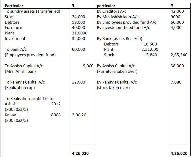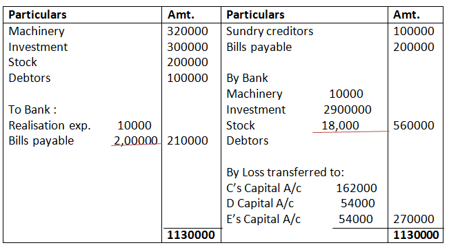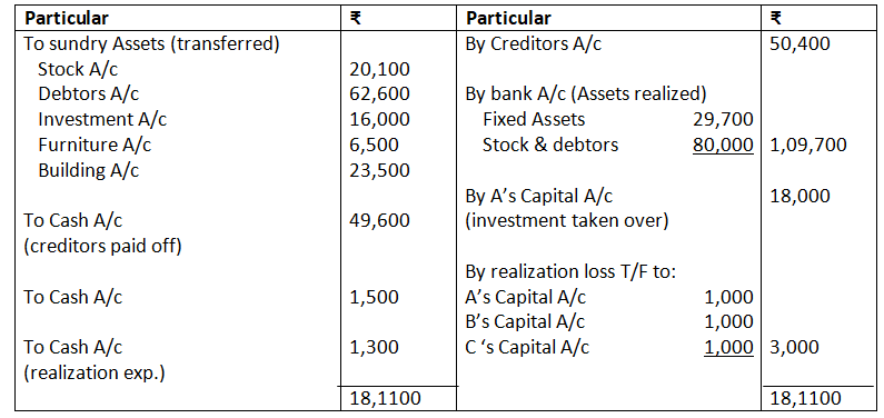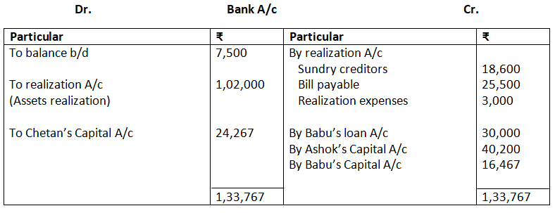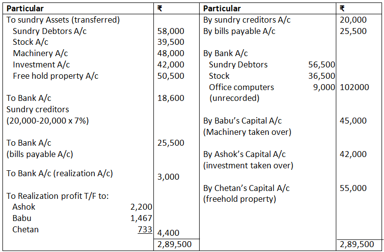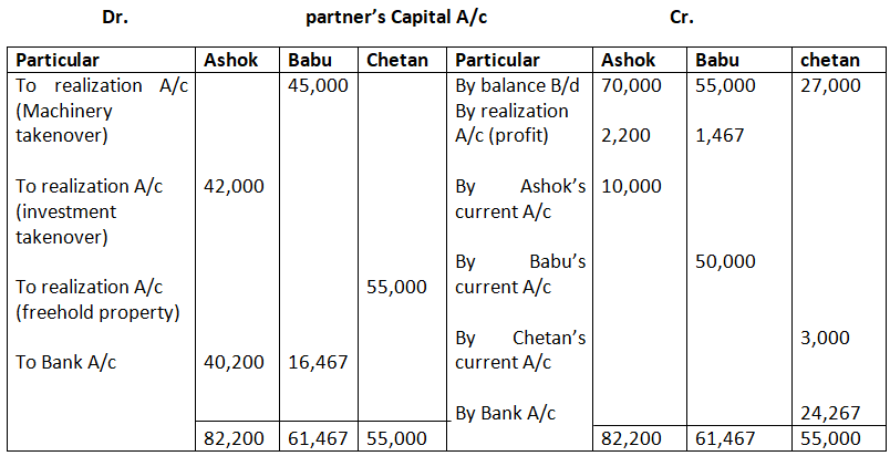 The Machinery was taken by Babu for ₹ 45,000, Ashok to over the investment and Freehold property was taken by Chetan at ₹ 55,000. The remaining Assets realized as follows: