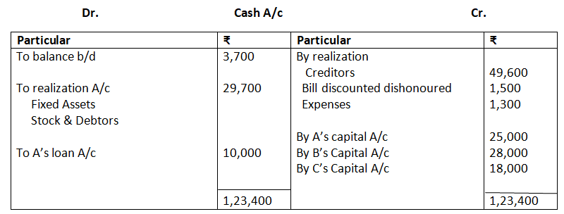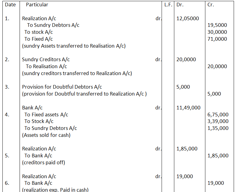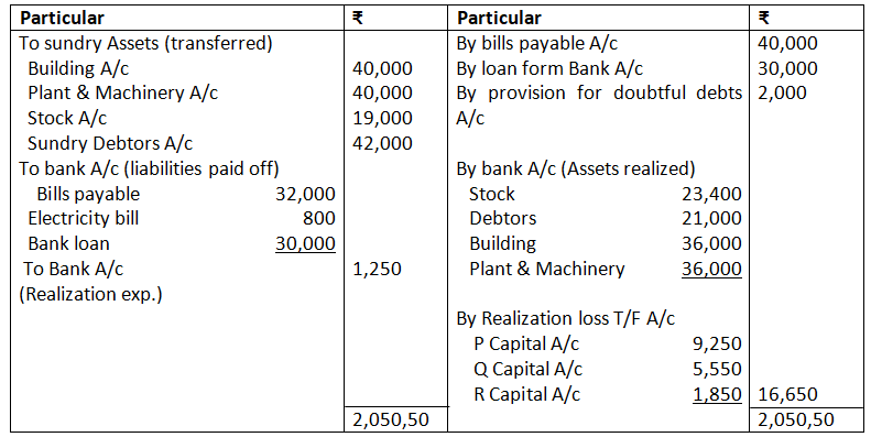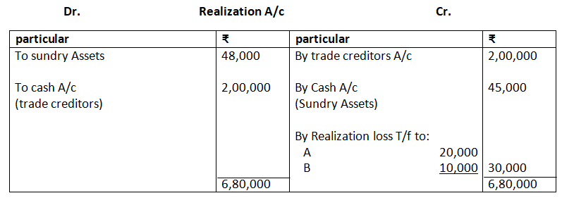 Sundry Debtors realized ₹ 30,000 and ₹ 42,000 respectively. The expenses of realization amounted to ₹ 1,200.