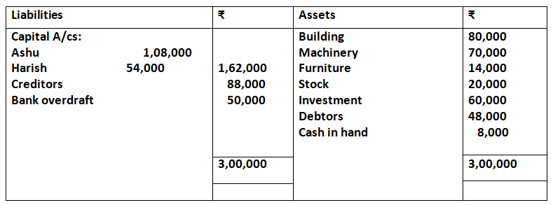 30. Ashu and Harish are partners sharing profit and losses as 3:2. They decided to dissolve the firm on 31st March, 2025. Their Balance sheet on the above date was: