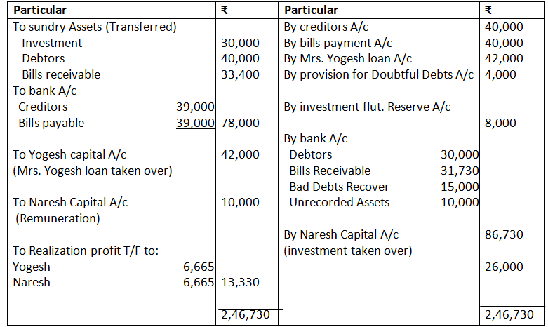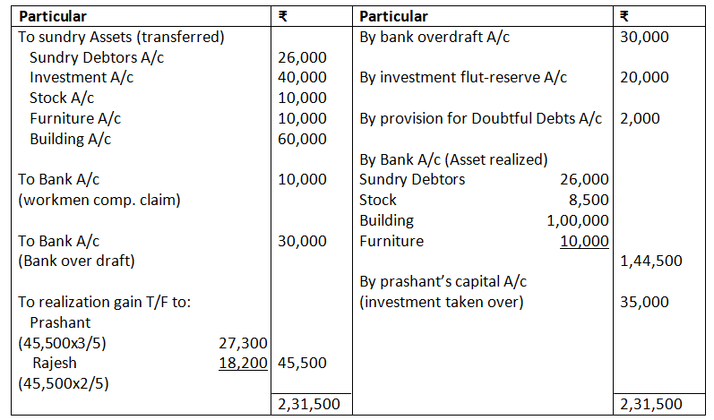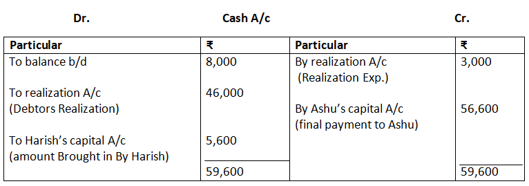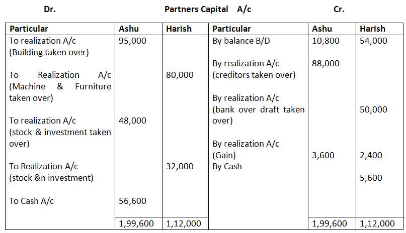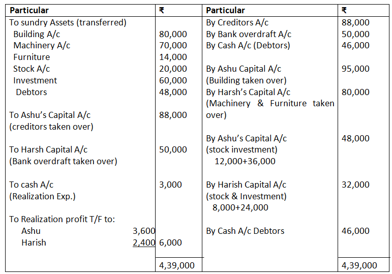 Ashu is to take over the building at ₹ 95,000 and machinery and Furniture is taken over by Harish at value of Rs.80,000. Ashu agreed to meet Bank overdraft. Stock and Investment are taken by both partner in profit-sharing ratio. Debtors realized for ₹ 46,000, expenses of realization amounted to 3,000. Prepare Ledger Accounts.