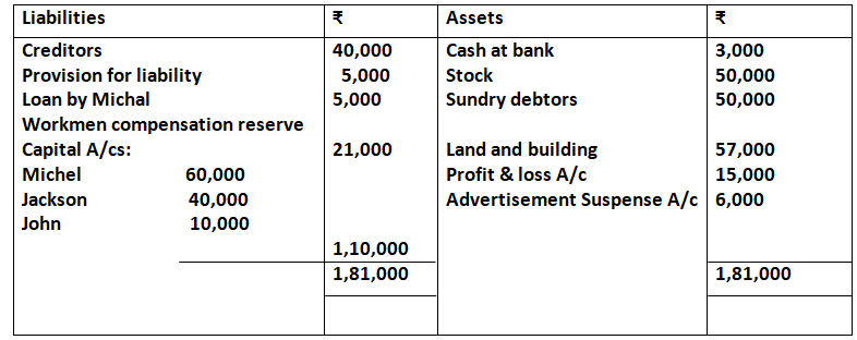 32. Michel Jackson and john are in partnership sharing Profits and losses in the proportions of 1/2, 1/3 and 1/6 respectively. On 31st March,2025, they decide to dissolve the firm. On this date the Balance Sheet stood as: