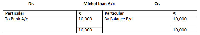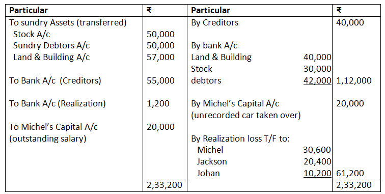 There was a car in the firm, which was written off form the books. It was taken by Michel for ₹ 20,000. He also agreed to pay outstanding salary of ₹ 20,000 not provided in books.