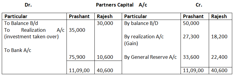 (iii) The firm had 100 shares of Rs.10 each which were taken over by the partners at market value of Rs.20 per share in their profit-sharing ratio of 3:2.