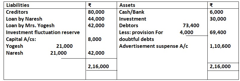 34. Yogesh and Naresh were partners sharing profits equally. They dissolved the firm on 1st April, 2025. Naresh was assigned the responsibility to realize the assets and pay the liabilities at a remuneration of ₹ 10,000 including expenses. Balance Sheet of the firm as on date was as follows: