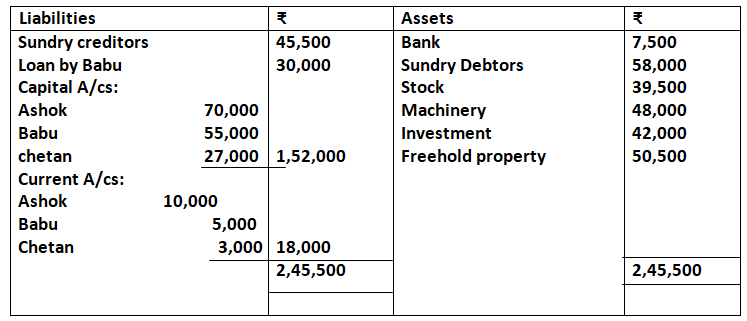 35. Ashok, Babu and Chetan are in partnership sharing profit in the proportion of 1/2, 1/3, 1/6 respectively. They dissolve the partnership on 31st March, 2025 when the Balance Sheet of the firm is as under: