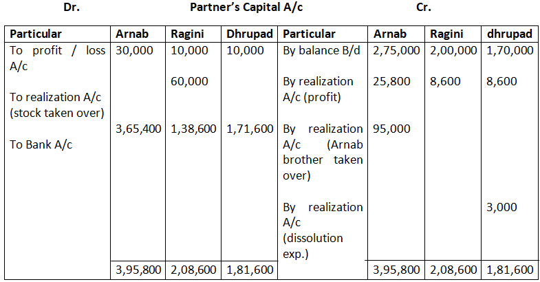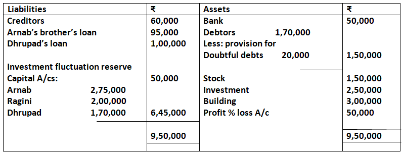 - Dissolution expenses were ₹8,000. ₹3,000 were to be borne by the firm the balance by Dhrupad. The expenses were paid by him.